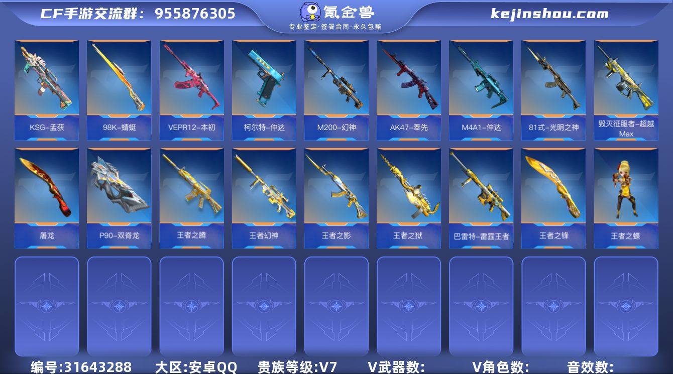 WLQZ508【V8 292V 335金V 5至尊2同框 心至尊 魄至尊 怒至尊 圣至尊 狱至尊 冰皮王圣 冰皮王迹 冰片王痕 王魄HS 王魂HS 王锋HS 奉先 AK47策 m4游骑兵套带皮 AWM游骑兵带皮 cop飞龙在天 黄金cop 王影 王兽 王尊 王神 王烈 王霆 常胜 妙才 】【等级】150【区服】手Q-苹果【金角色数】10【金武器数】292【金V角色】 樱 审判者 幽灵刀锋-觉醒 葵 关小雨 职场灵狐-赛事经理 子涵 妩媚妖姬 炽天使-X 救世主-X 复仇者 复仇者 【金V武器】 加特林-蟒蛇 王者之圣 巴雷特-毁灭 GLOCK18-猎神 汤姆逊-烈龙 M12S-雷霆 屠龙 屠龙 火麒麟闪光弹 9A91-天神 龙啸 沙鹰-修罗 98K-血月 死神手雷 M4A1-竞技战魂 地狱烈炎 擎天觉醒 M4A1-死神 AK47-无影 王者之怒 AWM-妙才 火麒麟闪光弹 M4A1-黑骑士 CZ75-穷奇 王者之魄 女皇利刃-幻兽 沙鹰-火麒麟 AK47-火麒麟 火麒麟烟雾弹 巴雷特-极光 燃烧弹-游骑兵 M4A1-黑龙 铁锹-游骑兵 沙鹰-游骑兵 AWM-游骑兵 M4A1-运输船 AK47-竞技战魂 王者之影 斯泰尔-幻兽 王者之痕 CZS2-心动次元觉醒 M4A1-死神 火麒麟手雷 QBZ03-死神 AN94-卷帘大将军 麒麟刺 M4A1-沙漠领主 幻兽烟雾弹 幻兽闪光弹 M4A1-游骑兵 AK47-角斗士 王者之魂 死神手雷 寒霜烈龙 沙鹰-幻兽 KSG-火力竞放觉醒 刘易斯-天使 屠龙 M4A1-雷神 TAC-天使 AK47-常胜 AA12-雷神 巴雷特-毁灭 尼泊尔-火麒麟 烟雾弹-雷霆 闪光弹-雷霆 高爆手雷-雷霆 屠龙 HK416-混世行者 墨刃-幻神 23-幻神 双持斯泰尔-天使 黑骑士手雷 QCW05-死神 M4A1-堕天神 AWM-裁决 嗜血金鲨 AK47-波塞冬 马来剑-毁灭 AK47-奉先 王者之迹 王者之圣烟雾弹 81式-光明之神 王者之圣手雷 王者之翼烟雾弹 黑骑士闪光弹 王者之心手雷 王者之心手雷 尼泊尔-机械纪元 王