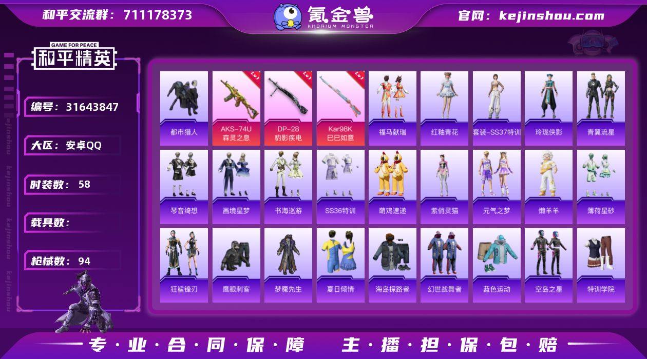 可二次实名【都市男神5特效枪 秒换绑不用等】 安卓Q区-21709热力值-1印记-58套装-94枪皮 【1稀有】 都市猎人【5特效枪】 AKS-74U-森灵之息(5级) Mk14-福马献瑞(5级) AA12-G-萌骑幻想(2级) Kar98K-巳巳如意(5级) DP-28-豹影疾电(4级)【100热门】 梦魇先生 鹰眼刺客 破蛋小黄鸡 白色伏地魔 AUG-幻影战神 M762-天降萌叽 UMP45-蓝色火焰 MG3-幻世战舞者 夏日倾情 特训学院 青年教官 魅力单车 蓝色运动 黄色运动 漫步者 黄色伏地魔 黑色伏地魔 海岛探路者 SKS-青瓷战姬 AA12-G-雨过天青 沙漠之鹰-雨过天青 平底锅-画境星梦 P90-紫矿核心 GROZA-紫矿核心 玲珑侠影 M16A4-雨过天青 SPAS-12-福马献瑞 雨过天青 MG-36-薄荷星砂 撬棍-冰晶雪宝 福马献瑞 破片手榴弹-爆破雪人 ACE32-冰晶雪宝 鱼渊荷华 青翼流星 PKM-啾咪啾咪 燕燕于飞 巳巳如意 狂鲨锋刃 SS36特训 异域银装 智谋强哥 战术大师 晶辉守护 Mk14-紫晶流影 平底锅-无垠阁 Mk14-薄荷星砂 S12K-幻影战神 AUG-紫晶流影 AMR-鸡智如我 燃烧瓶-福马献瑞 ACE32-画境星梦 M1加兰德-画境星梦 GROZA-海盐豹豹 琴音绮想 破片手榴弹-巳巳如意 AKM-涂鸦街区 野牛-燕燕于飞 突击盾牌-绝对恒星 SPAS-12-燕燕于飞 Vector-燕燕于飞 元气之梦 蝎式手枪-燕燕于飞 街头风暴 十字弩-燕燕于飞 S12K-霓彩脉冲 AKM-霓彩脉冲 AUG-异域银装 MP5K-画境星梦 十字弩-异域银装 AA12-G-画境星梦 破片手榴弹-拽到爆炸 信号枪-异瞳寒姬 十字弩-异瞳寒姬 Famas-霓彩脉冲 SVD-霓彩脉冲 SLR-霓彩脉冲 UMP45-极意拳锋 铝热弹-炫彩糖果 UZI-炫彩糖果 AUG-冰晶雪宝 MK20-H-狂鲨锋刃 平底锅-空岛之星 SPAS-12-狂鲨锋刃 P90-巳巳如意 S686-巳巳如意 紫俏灵猫 M249-冰晶雪宝 萌鸡速递