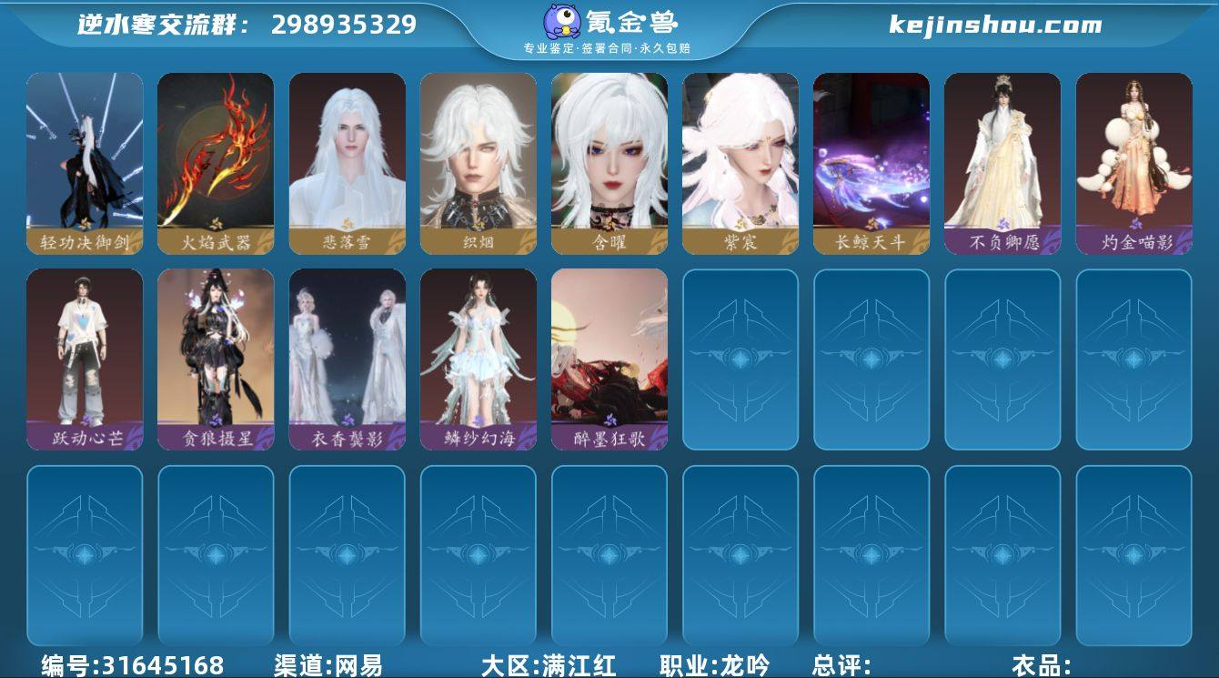 网易支付状态:不可注销 换绑冷却:无冷却 职业:龙吟 轻功决·御剑,火焰武器,悲落雪,织烟,含曜,紫宸,明河曙天·长鲸天斗 不负卿愿,灼金喵影,跃动心芒,贪狼摄星,衣香鬓影,鳞纱幻海,醉墨狂歌