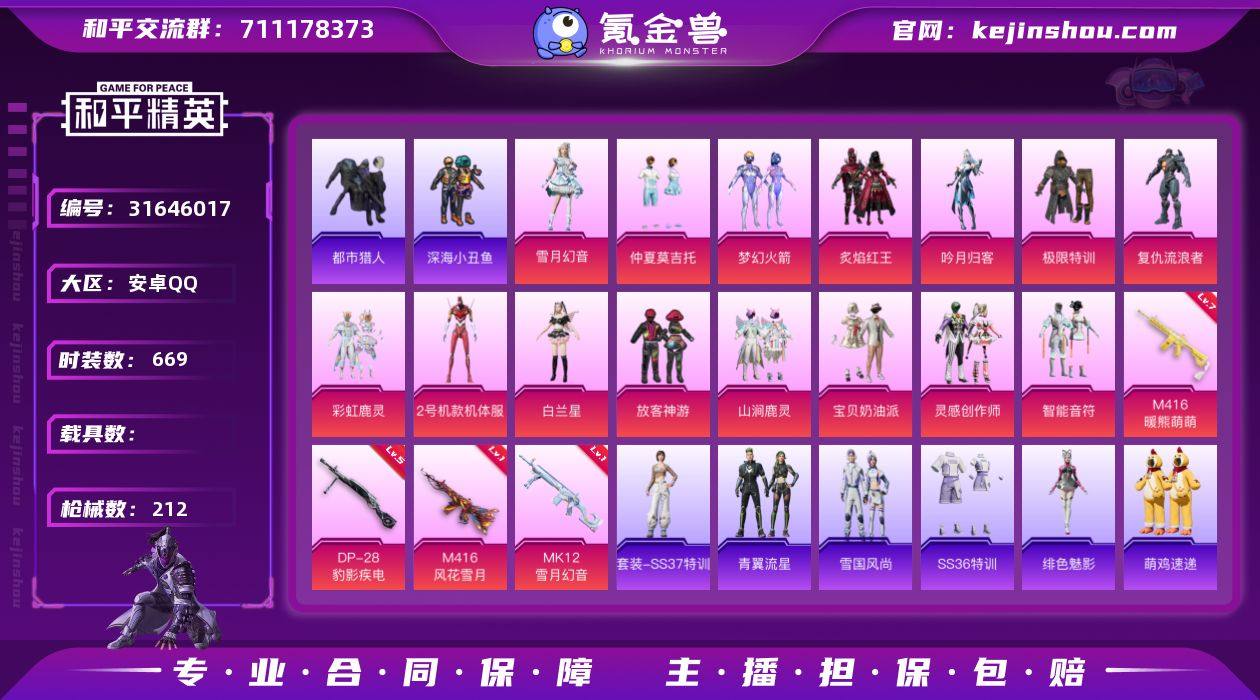 DX018 ¥1488 安卓Q区 精品微氪 15款粉装(梦幻火箭+红螳螂+放客)紫装(暗影+小丑鱼+都市) 4款特效枪外加7级M4 14款战备