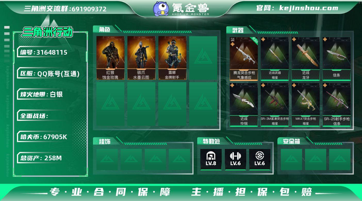 "YXB-4刀-67905k哈伏币-总资产258m流动资产223m-60烽火等级-白银-33战场等级-上等兵 部门22322特勤处仓库8训练中心6靶场6 【干员外观】:红狼-蚀金玫瑰,骇爪-水墨云图,露娜-金牌射手 【近战皮肤】:近战-暗星,近战-信条,近战-怜悯,近战-龙牙,近战-黑鹰 【典藏外观】:腾龙突击步枪-气象感应优品B毒 【传说外观】:M4A1突击步枪-蚀金玫瑰,K416突击步枪-尖峰行动,M7战斗步枪-白玫瑰,SG552突击步枪-运动员,SCAR-H战斗步枪-水墨云图,MK47突击步枪-暗星,P90冲锋枪-信条,SMG-45冲锋枪-巳蛇,SR-3M紧凑突击步枪-暗星,M14射手步枪-蛮荒,SR-25射手步枪-信条,M700狙击步枪-尖峰行动,沙漠之鹰-阿瑞斯之怒 【挂饰】:挂饰-黑夜猎手,挂饰-黄金视野,挂饰-蚀金玫瑰,挂饰-信条,挂饰-暗星,挂饰-崩岩重炮,挂饰-暗行哨兵,挂饰-福禄,挂饰-聚宝盆,挂饰-枪匠,挂饰-雪人,挂饰-紧急撤离,挂饰-麻将 "