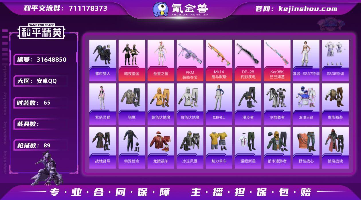 【0载具 4特效枪 2粉装 89枪皮 65套装】套装-都市猎人,套装-浪漫天命,套装-暗影哥特,套装-暗夜鎏金,角色-2B战斗服款,角色-圣堂之誓,Kar98K-巳巳如意,Mk14-福马献瑞,DP-28-豹影疾电,PKM-萌骑夺宝,编号:JJFQK43