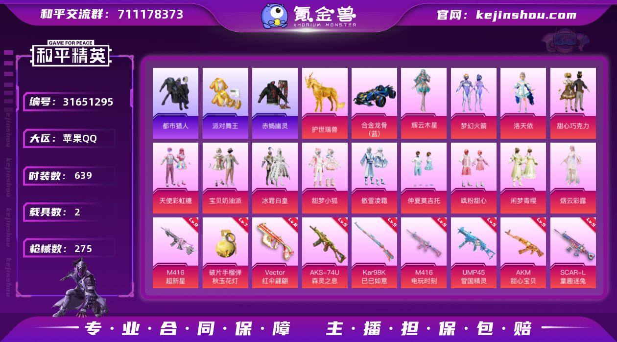 J1499 精品号 2红 17粉 13特 2载具 2级暮色玫影 敖丙 冥河战士 都市猎人 赤歇幽灵 派对舞王 暗影哥特 兔兔白日梦 放客神游 星之彼岸 新101 千金淑猫 智能音符 红熊茄茄 苹果 手Q-2神装-18粉装-13特效枪-2载具-11粉色飞行器-138422热力值-21王牌印记-293套装-366枪皮 【红色神装等级】:暮色玫影-艾丽娅(二级),魔童闹海-敖丙(一级) 【红色角色神装】:暮色玫影-艾丽娅,魔童闹海-敖丙 【热门品类】:粉装-梦幻火箭,套装-浪漫天命,套装-赤蝎幽灵,套装-都市猎人,套装-冥河战士,套装-派对舞王,套装-深海小丑鱼,套装-小丑鱼,角色-军刀雅典娜,套装-胖达团团,套装-龟仙人,套装-潮萌小黄鸭,套装-暗影哥特,套装-粉红小猪,套装-糯粉咩咩,套装-软软马卡龙,角色-8号机,角色-Mark.06,套装-红熊茄茄 【粉色套装】:角色-绝对恒星,粉装-粉色回忆,粉装-梦幻火箭,粉装-智能音符,粉装-放客神游,粉装-星之彼岸,粉装-恐龙拽拽,女娲后裔-赵灵儿,粉装-冰川幽秘,粉装-霞光圣骑,粉装-暗夜鎏金,粉装-未来歌姬,角色-烟云彩露,角色-千金淑猫,粉装-幻彩电音,角色-冰魄,角色-羊梦糖心,角色-异瞳寒姬 【粉色枪皮等级】:AKM-暮色玫影(三级),SCAR-L-青春物语(七级),M416-电玩时刻(五级),AUG-星之彼岸(三级),蜜獾-异瞳寒姬(五级),Kar98K-巳巳如意(五级),Mk14-精灵梦叶罗丽(七级),M417-第五大道(七级),M249-绝对恒星(三级),DP-28-暗夜鎏金(七级),DP-28-豹影疾电(五级),MG-36-沧焰双生(五级),平底锅-喜羊羊与灰太狼(三级) 【粉色载具】:冰绡玉鳞,暮色幽蹄 【粉色枪皮】:AKM-暮色玫影,SCAR-L-青春物语,M416-电玩时刻,AUG-星之彼岸,蜜獾-异瞳寒姬,Kar98K-巳巳如意,Mk14-精灵梦叶罗丽,M417-第五大道,M249-绝对恒星,DP-28-暗夜鎏金,DP-28-豹影疾电,MG-36-沧焰双生,平底锅-喜羊羊与灰...