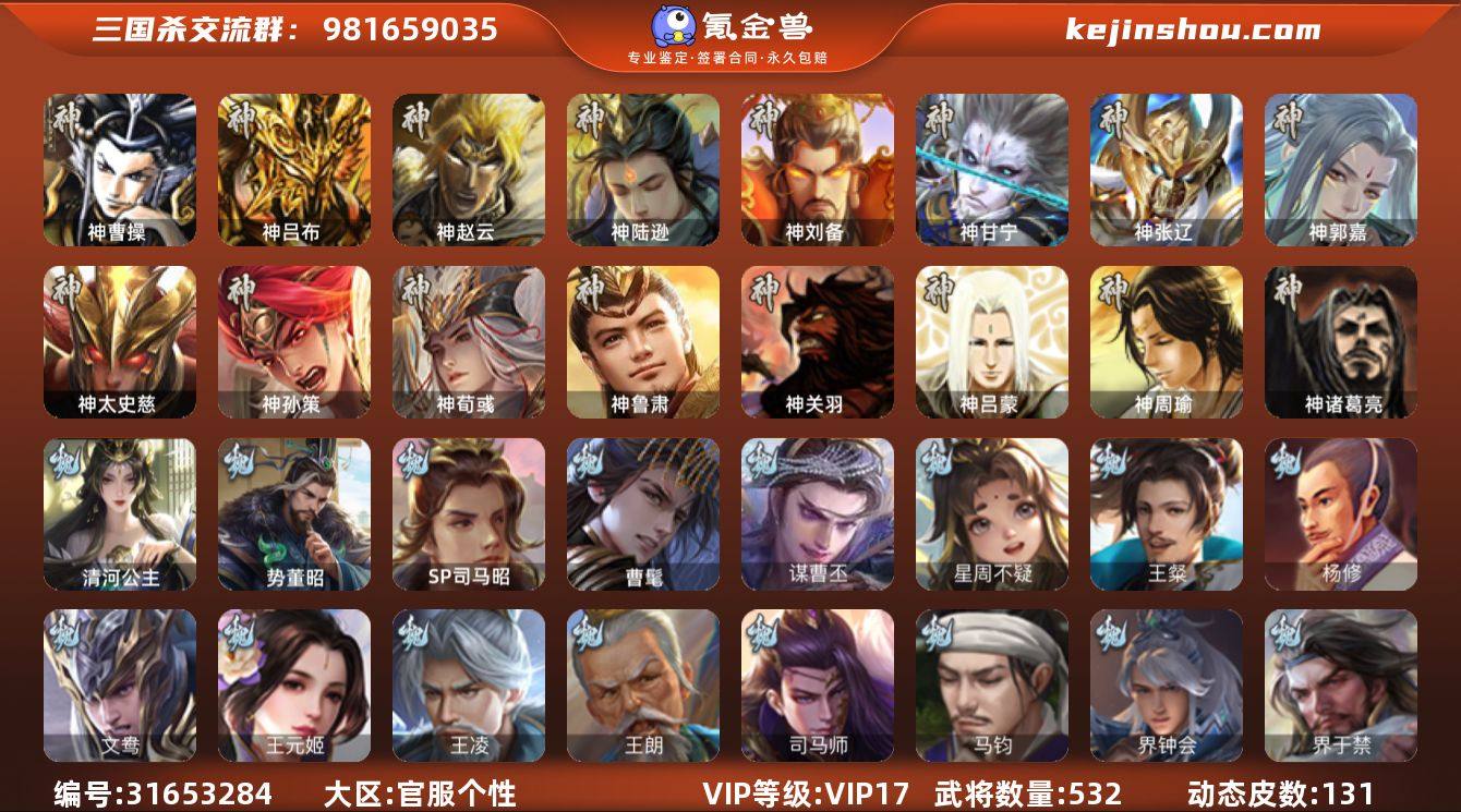 VIP等级: VIP17 官阶: 大将军 武将数量: 531 动态皮肤数量: 145 神将: 神曹操,神甘宁,神郭嘉,神刘备,神陆逊,神吕布,神司马懿,神孙策,神太史慈,神荀彧,神张辽,神赵云,神关羽,神吕蒙,神周瑜,神诸葛亮,神鲁肃,神华佗 魏国武将: 刘晔,戏志才,曹纯,曹婴,陈琳,程昱,郝昭,嵇康,界曹真,界于禁,界钟会,马钧,司马师,魏-司马昭,王朗,王凌,王元姬,文鸯,羊徽瑜,杨修,王粲,张昌蒲,唐咨-魏,张辽,SP蔡文姬,SP曹仁,SP关羽,SP贾诩,SP姜维,SP庞德,卞夫人,蔡贞姬,曹昂,曹操,曹冲,曹洪,曹丕,曹仁,曹叡,曹嵩,贾逵,王异,张恭,鲁芝,界满宠,曹休,界曹植,满宠,荀攸,王基,钟繇,蒯越蒯良,郭嘉,牵招,荀彧,阮慧,杜畿,界郭嘉,崔琰,界曹丕,界荀彧,朱灵,界甄姬,辛毗,吕虔,界陈群,界王异,界许褚,界郭淮,华歆,陈群,界邓艾,界典韦,谋甄姬,司马孚,袁涣,李通,乐进,辛宪英,谋曹仁,郭淮,毛玠,界曹彰,郭皇后,毌丘俭,夏侯惇,曹植,司马朗,谋于禁,界曹操,星周不疑,许褚,界张辽,谋徐晃,蒋干,张郃,钟会,文聘,郭女王,曹彰,界夏侯惇,诸葛诞,司马懿,甄姬,界徐晃,徐晃,界曹仁,孙资刘放,韩浩史涣,胡班,曹真,谋曹丕,典韦,界夏侯渊,谋荀彧,夏侯渊,李典,于禁,王双,邓艾,界司马懿,张春华,孟达-魏,臧霸,牛金,朱灵(国战),谋夏侯惇,曹髦,成济,玄·毌丘俭,李昭焦伯,清河公主,SP司马昭,董昭,势董昭,谋张辽 蜀国武将: 鲍三娘,董允,关索,花鬘,界黄忠,傅佥,谯周,沙摩柯,王平,张星彩,赵襄,周群,诸葛瞻,谋马超,谋赵云,谋夏侯氏,谋黄忠,马云騄,谋黄月英,徐庶,界魏延,杨仪,吕凯,界关羽,界诸葛亮,邓芝,界伊籍,胡金定,费祎,严颜,界黄月英,界张嶷,赵云,张松,彭羕,李丰,界刘备,谋法正,界刘禅,刘封,糜竺,李遗,蒋琬,谋庞统,黄月英,刘巴,关羽,王甫赵累,吴懿,界吴懿,界廖化,向宠,祝融,张飞,黄皓,陈震,魏延,界周仓,谋祝融,马忠,界法正,糜夫人,界孟获,刘禅,界赵云,谋诸葛亮,界姜维,张翼,关银屏,界...