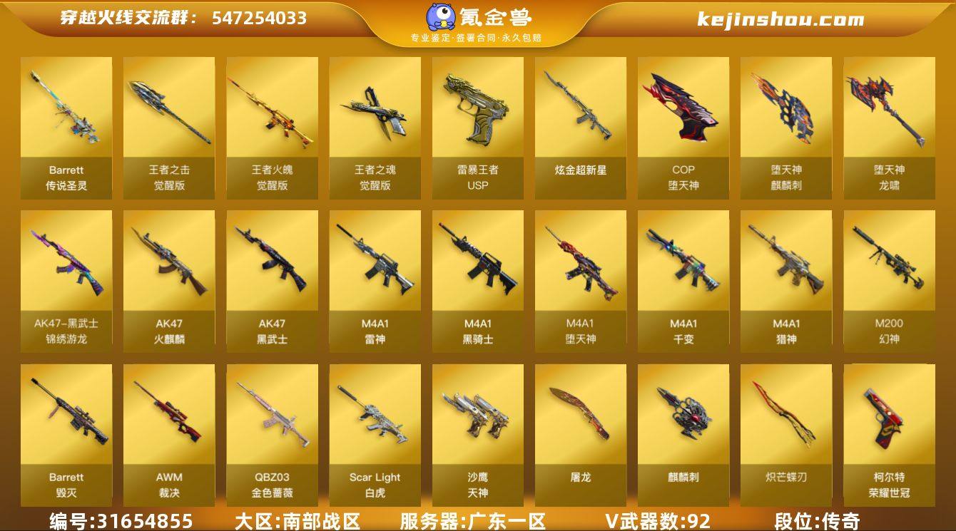 广东一区-97V-11王者武器数-1炫金武器数 【传说武器】:传说圣灵 【热门武器】:传说圣灵,QBZ03-金色蔷薇,Scar Light-白虎,M200-幻神,荣耀世冠-雷神,荣耀世冠-柯尔特*2,M4A1-黑骑士,火麒麟-绝迹,COP-堕天神,炽芒蝶刃*2,金刚伞 【王者炫金武器】:USP-雷暴王者,炫金超新星,王者之魄高爆手雷*3 【音效卡】:M4A1-雷神音效卡,M4A1-黑骑士音效卡 【皮肤】:幻神-AG-CFPLS17冠军,白虎-AG-CFPLS20冠军,QBZ03-AG-CFPLS19冠军,雷神-烈虎皮肤,雷神-荣耀世冠AG,传奇石头-横秒之巅,火麒麟-百城,火麒麟-心动糖果,黑骑士-冠军之势,战神-粉色甜心皮肤,战神-紫绶金章皮肤*2,战神-流金岁月皮肤,AK47-B-常胜将军-曹操,AK47-B-常胜将军-刘备*2,AK47-B-常胜将军-孙权,屠龙-荣耀世冠AG,麒麟刺-甜蜜糖果 皮肤 【角色】:迷迭香,晴雅,暗夜-X,芳心审判者,飞虎队-X,风暴女,虎妞,嘉年华灵狐,兰妹妹,灵狐者-X,龙儿-小淘气,麻雀,潘多拉-X,潘多拉-甜心教官,潜龙队-X,斯沃特-X,蜀雪,铁骑荣耀 【人偶武器】:火麒麟-绝迹,巴雷特-零-水下丽影,AWM-灵狐-15周年嘉年华,迷你生化手雷,闪光弹-小乔,闪光弹-貂蝉,高爆手雷-大乔,灵狐娃娃手雷 【挑战大师】:冰龙粉碎者-白马银枪,神圣爆裂者-末日III*2 【英雄级武器】:M4A1-千变,AK47-火麒麟*2,M4A1-雷神,M4A1-黑骑士,AK47-黑武士,M4A1-堕天神,Scar Light-白虎,黑武士-锦绣游龙,QBZ03-金色蔷薇,M4A1-猎神,AK-47-猩红传说,王者火魄-觉醒版,AK47-B-常胜将军,荣耀世冠-雷神,Barrett-毁灭,AWM-裁决,M200-幻神,沙鹰-天神*5,COP-堕天神,荣耀世冠-柯尔特*2,USP-神工天巧*2,王者之魂-觉醒版,屠龙,麒麟刺-堕天神,麒麟刺*2,炽芒蝶刃*2,唐刀-神工天巧,龙啸-堕天神*2,斩神刀-雷暴,王者之击-觉醒版,高爆手雷-雷霆,高爆手雷-雷...