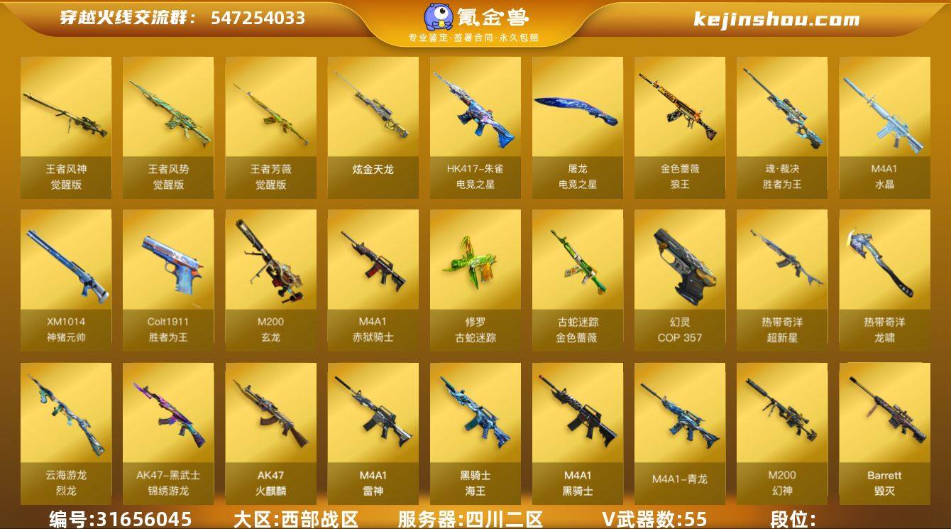 西部战区(四川二区)ys【生化挑战爆破三全号】【臻选次元套装+AA12-擎天柱III+挑战9阶段+BOSS卡135张】55v【M200-幻神套+双皮(纸灯龙+电流骇客),Kar98k-星神+音效卡,王者风神,古蛇迷踪套装,热带奇洋套装,云海游龙套装,G36C-幻影,ScarLight-白虎+音效卡,M4A1-青龙,6盘龙+6烈龙+死亡之眼,COP357-幻灵,Colt1911-大黄蜂,猫猫手套】3王者【王者风神,王者芳薇,王者风势】1炫金【炫金天龙】6角色【四防关小雨,四防隼,奇洋探员,蛇隐宗,云海玲珑,幻面灵狐】7音效【M200-幻神音效卡,Kar98k-星神音效卡,ScarLight-白虎音效卡,Barrett-毁灭音效卡,M4A1-黑骑士音效卡,HK417-朱雀-电竞之星-竞星悦动音效卡,屠龙-电竞之星-竞星悦动音效卡】11皮【幻神-纸灯龙,幻神-电流骇客,雷神-航星,炼狱-末日审判,雷神-化蛇,黑骑士-破界,火麒麟-CF STAR,毁灭-英雄计划】挑战枪【AA12-擎天柱III,封神放逐者III,试炼破坏者III】【vip5】截图展示段位不代表实际段位 如赛季更新等不可抗拒因素发生变化、时限道具不保证所剩时间