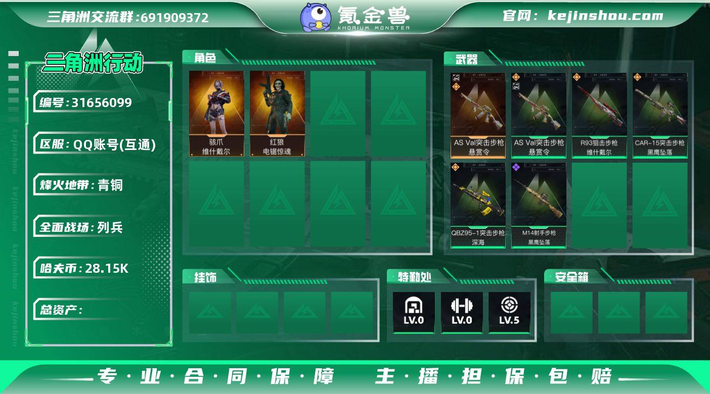【优品A AS Val突击步枪-悬赏令 红皮骇爪 30颗AW子弹】总资产61M,哈夫币28,155K,行动等级:60,传说典藏数量:1,干员红皮数量:1,仓库等级:7,训练中心等级:6,靶场等级:4,干员皮肤:2,枪皮:55 【传说典藏】 AS Val突击步枪-悬赏令 【近战武器】 黑鹰 【干员皮肤】 骇爪-维什戴尔 红狼-电锯惊魂 【传说挂饰】 维什戴尔 【载具】 全地形车-森林迷彩 【其他典藏】 AKM突击步枪-噬菌体 【枪皮】 M4A1突击步枪-高雅黑 G3战斗步枪-高雅黑 QBZ95-1突击步枪-海色 SCAR-H战斗步枪-荣耀列队 PTR-32突击步枪-黄蜂 SG552突击步枪-海浪 M4A1突击步枪-黑金玫瑰 SCAR-H战斗步枪-数码迷彩 M4A1突击步枪-粉色涂装 AUG突击步枪-浅蓝涂装 SG552突击步枪-浅蓝涂装 K416突击步枪-高雅黑 SV-98狙击步枪-红色涂装 SR-25射手步枪-黄蜂 SMG-45-行动开启 MP5冲锋枪-海色 SMG-45冲锋枪-幻影结构 UZI冲锋枪-海色 MP5冲锋枪-黄蜂 Vector冲锋枪-先锋 Vector冲锋枪-几何迷彩 MP5冲锋枪-弄臣 M1014霰弹枪-海浪 G18-星链科技 沙漠之鹰-海浪