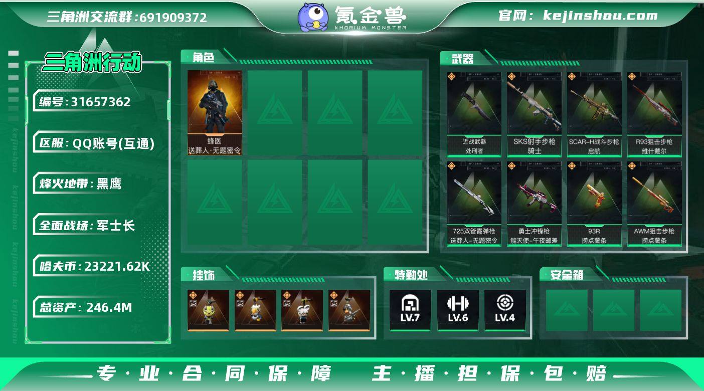 实名:可二次实名 总资产:246.4M 哈夫币:23221.62K 烽火地带段位:黑鹰 烽火地带等级:60 全面战场段位:军士长 全面战场等级:42 7级仓库,6级训练中心,4级靶场,5级指挥中心,1级潜水中心,3级防具台,3级工作台,3级制药台,3级技术中心,1级收藏室 战术部门等级:2 战斗部门等级:2 医疗部门等级:2 研发部门等级:2 后勤部门等级:1 曼德尔砖-气象感应:0 曼德尔砖-命运王牌:0 曼德尔砖-电玩高手:0 曼德尔砖-美杜莎:0