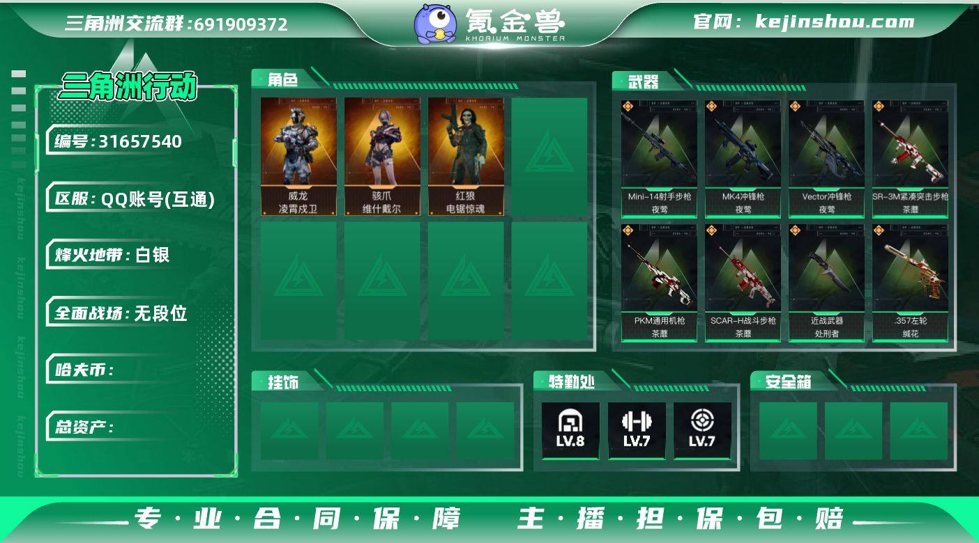 hf13581总资产162m+s8赛季3x3安全箱+凌霄戍卫全套+维什戴尔全套+电锯惊魂红狼全套+处刑者刀+鹅鸭杀全套+缄花全套+茶蘼全套+夜莺全套+烽火等级60+特勤部门等级可以+永久包赔