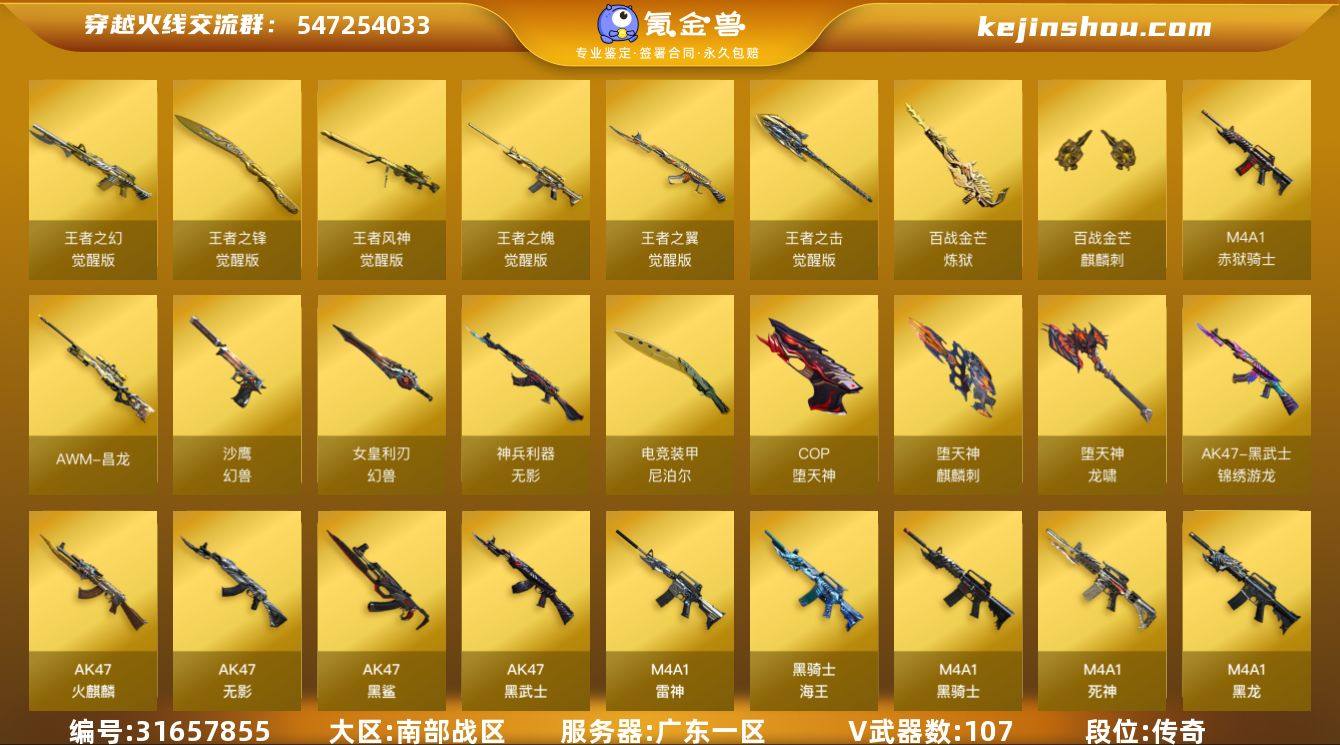 广东一区-121V-9王者武器数-0炫金武器数 【热门武器】:QBZ03-金色蔷薇,死亡之眼,M4A1-黑骑士,汤姆逊-烈龙*3,RPK-盘龙,加特林-炼狱,COP-堕天神*2,沙鹰-修罗*3,高爆手雷-幻兽*2 【音效卡】:M4A1-黑龙音效卡,M4A1-黑骑士音效卡,Barrett-毁灭音效卡,麒麟刺-百战金芒-盛典舞曲音效卡,炼狱-百战金芒-庆典舞曲音效卡 【皮肤】:雷神-宠儿-2019MVP,雷神-源计划2.0专属 皮肤,M4A1-再燃火线,雷神-神秘按键 皮肤,火麒麟-平天大圣,火麒麟-心动糖果,毁灭耀金皮肤,毁灭-黑大圣皮肤,毁灭-英雄计划 皮肤,黑龙-能量核心,黑骑士耀金皮肤,无影-能量核心,无影耀金皮肤,天龙-能量核心,修罗-能量核心,轻型军用手斧-再燃火线 【角色】:魅影,迷迭香,影豹,隼,战地猎狐,王者-零-国色天香,堕落女神,风暴女,虎妞,嘉年华灵狐,娟娟,兰-新年限定,龙儿,麻雀,曼陀罗-礼服,潘多拉-X,潘多拉-甜心教官,潜龙队-X,青霞仙子,斯沃特-X,铁骑荣耀,新娜塔莎,夜玫瑰-宠粉,影武者-X,游珑儿 【人偶武器】:M37-葵,COP-旗袍,迷你深渊冰龙,迷你牛魔王,迷你波特博士,迷你牛牛,深渊终结者手雷,迷你艾比,迷你巨石泰坦-魔花研究所,灵狐娃娃手雷 【暴走生化】:死亡之眼,超级对讲机 【挑战大师】:神圣爆裂者III,AK47-冰龙粉碎者,激光毁灭者III,KAC-圣炎切割者III,神圣爆裂者-末日III,阐释者III 【英雄级武器】:AK47-火麒麟*2,M4A1-黑龙,M4A1-雷神,M4A1-黑骑士,AK47-无影,M4A1-死神,AK47-黑武士,AK47-黑鲨,M4A1-龙血*2,无影-神兵利器,黑武士-锦绣游龙,QBZ03-金色蔷薇,M4A1-猎神,王者之翼-觉醒版,王者之魄-觉醒版,王者之幻-觉醒版,AK-47-猩红传说,黑骑士-海王*3,AWM-天龙,Barrett-毁灭,AWM-裁决*2,Barrett-电竞装甲,Barrett-金色蔷薇,王者风神-觉醒版,RPK-盘龙,加特林-...