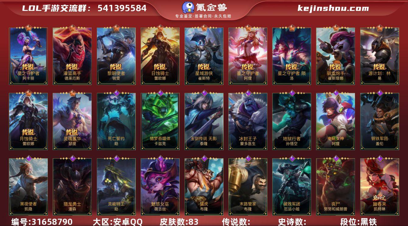 【LSC435】74英雄/83皮肤/华贵铂金/星域游侠卡牌/星之守护者 阿卡丽/星之守护者阿狸/日蚀骑士蕾欧娜/月蚀骑士蕾欧娜/驯龙炮手/星之守护者 陨/深海奇域 厄运小姐/灵魂莲华腕豪/西部魔影 永恩/源计划:林/灌篮高手/黎明使者锐雯/钢铁军团/黑夜使者凯隐/丧尸努努/地狱行者猴子/无限烈焰/斗魂无双赵信/猎梦吞噬体 卡兹克/清剿小队金克丝/末路管家/猛虎布隆/灵魂莲华辛德拉/猎龙勇士潘森/源计划:火/电玩女神阿狸/死亡誓约劫/灵能特工劫/战斗学院蕾欧娜/我,羽饰骑士 崔丝塔娜/星之守护者琴女/永恒之森 霞/冰封王子/破败军团女枪/心之钢永恩/战斗教授男枪/暗星墨菲特/战场之王炸弹人/泳池派对炸弹人/斗魂无双 艾瑞莉娅/星域学者/战斗学院阿克尚/踏春来女警/欧米伽小队 天雷爆破手 维迦/我,怒角/玉剑传说 无影/魅惑女巫薇古丝/s15龙冕异士/S18冠翎巨神像/S19冠翎征服者/游侠法师/苍穹之光薇恩/时之砂/兄弟已百暴! 泰达米尔/双城之战金克丝/龙冕异士戏命师/冠翎征服者 尼菈/银色之牙/西部牛仔亚索/焰尾妖狐/冲击之刃劫/宗师级钓鱼训练师/末世天使/绝命抢手/铁拳执事/双城之战蔚/至高之拳/刺客信条/熔火之心/制胜金球/末路教父/暴风女神/女皇/黑暗骑士牛头/科学狂人/飞车暴走族/鲛泥座人/苍穹之光韦鲁斯/冲浪高手/光执事EZ/风执事/冠翎巨神像 加里奥/腥红之月 鬼武者/枯萎之壤/鳄霸