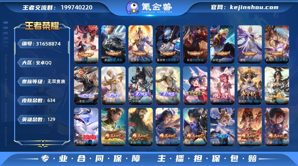 【无双V10顶级成品号】王者荣耀 安卓QQ区 英雄129个,皮肤634+,荣耀典藏9,无双至尊7,珍品传说2,星传说9,传说稀有55,定51 账号皮肤多,稀有皮肤全,适合直接上手玩 账号安全,支持正常登录 价格可小刀,喜欢直接拍