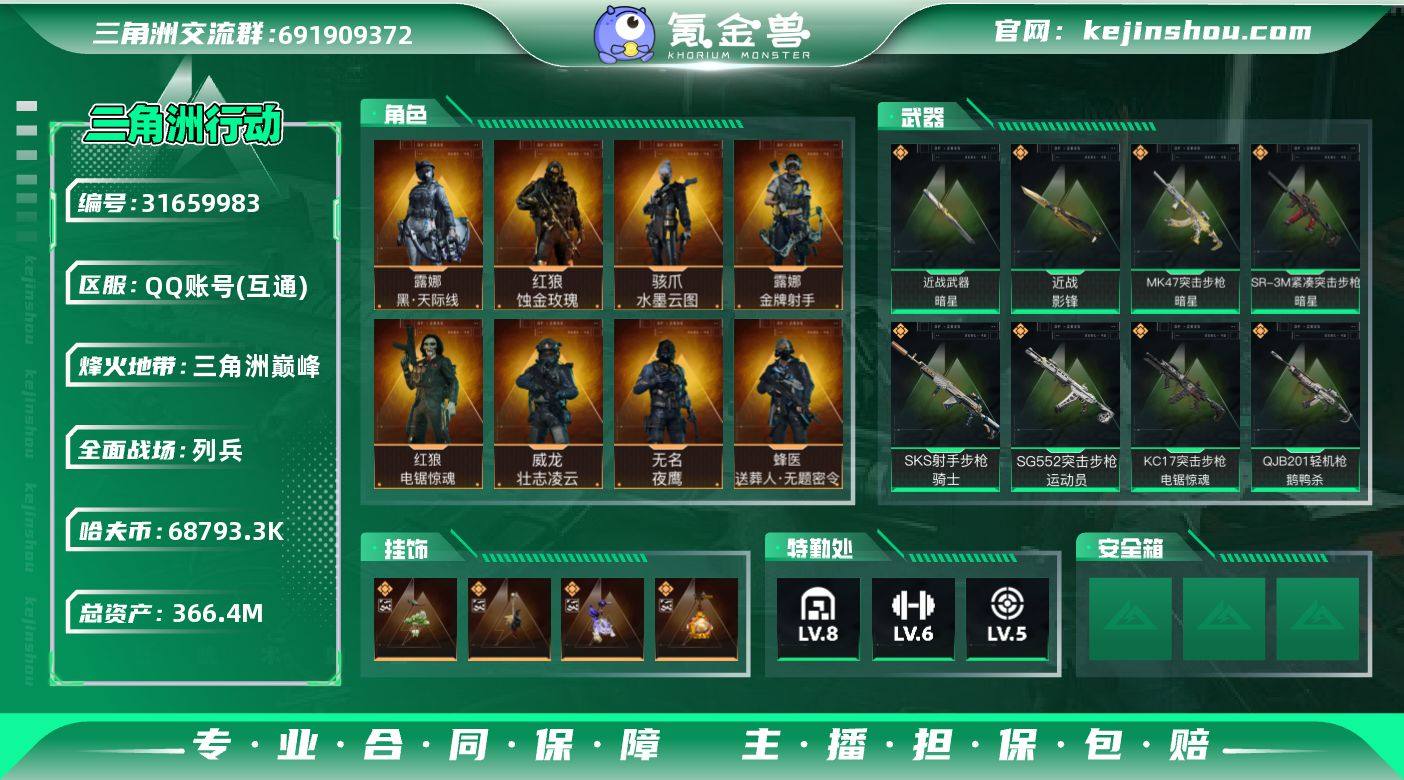 实名:不可二次实名 总资产:366.4M 哈夫币:68793.3K 烽火地带段位:三角洲巅峰 烽火地带等级:60 全面战场段位:列兵 全面战场等级:22 8级仓库,6级训练中心,5级靶场,5级指挥中心,1级潜水中心,3级防具台,3级工作台,3级制药台,3级技术中心,2级收藏室 战术部门等级:3 战斗部门等级:2 医疗部门等级:2 研发部门等级:2 后勤部门等级:2 曼德尔砖-气象感应:0 曼德尔砖-命运王牌:0 曼德尔砖-电玩高手:0 曼德尔砖-美杜莎:0
