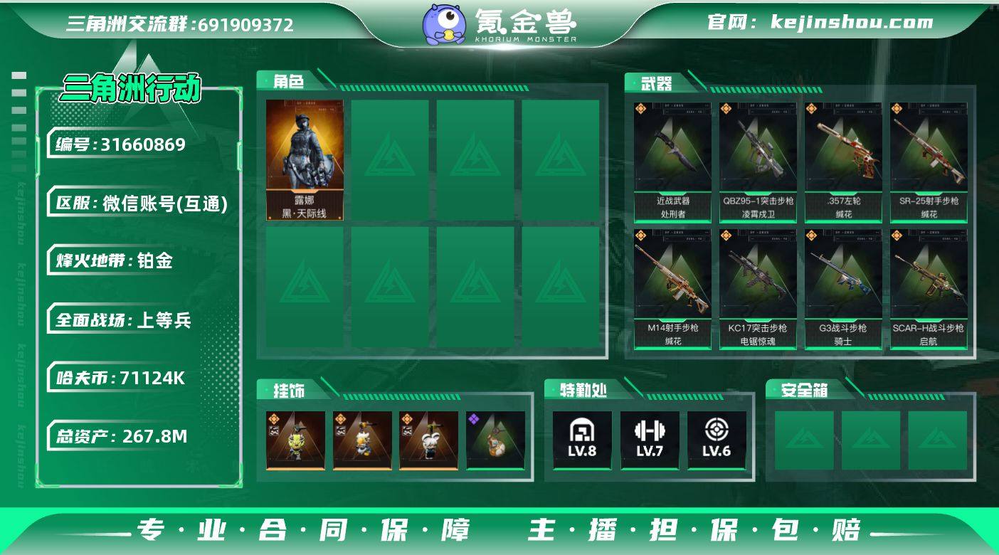 实名:可二次实名 总资产:267.8M 哈夫币:71124K 烽火地带段位:铂金 烽火地带等级:60 全面战场段位:上等兵 全面战场等级:41 8级仓库,7级训练中心,6级靶场,2级潜水中心,1级收藏室 战术部门等级:3 战斗部门等级:3 医疗部门等级:3 研发部门等级:2 后勤部门等级:3 曼德尔砖-棱镜攻势S2:0