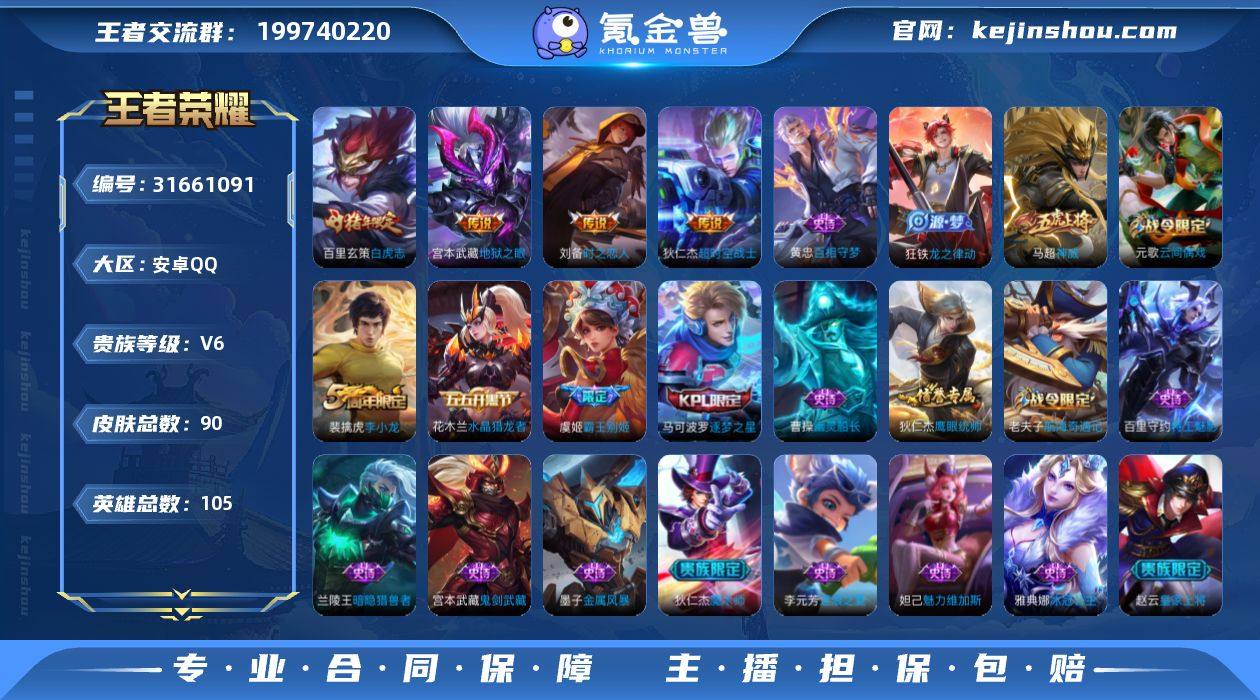 【WZ180725】90皮肤-4传说-20史诗【传说皮肤】:刘备时之恋人,百里玄策白虎志,宫本武藏地狱之眼,狄仁杰超时空战士【限定皮肤】:狄仁杰阴阳师,赵云皇家上将,墨子神迹守卫,高渐离玩趣恶龙,元歌云间偶戏,马可波罗逐梦之星,狄仁杰魔术师,狄仁杰万华元夜,达摩沙漠行僧,项羽海滩派对,老夫子醍醐杖,老夫子航海奇遇记,程咬金演武夺筹,兰陵王金庭之子,亚瑟潮玩骑士王,牛魔御旌,虞姬霸王别姬,钟馗驱傩正仪,鬼谷子原初探秘者,苏烈千军破阵,百里玄策白虎志,弈星混沌棋,明世隐疑决卦,裴擒虎李小龙,米莱狄御霄,盾山御銮【年限皮肤】:百里玄策白虎志【赛季限定】:米莱狄御霄,牛魔御旌,盾山御銮,弈星混沌棋,明世隐疑决卦,老夫子醍醐杖,鬼谷子原初探秘者,狄仁杰万华元夜,程咬金演武夺筹,钟馗驱傩正仪,苏烈千军破阵,达摩沙漠行僧,兰陵王金庭之子,东皇太一噬灭天穹,钟馗虚灵犬护,甄姬逆浪荇歌,亚瑟荣光之誓【战令限定】:元歌云间偶戏,亚瑟潮玩骑士王,老夫子航海奇遇记,墨子神迹守卫【史诗皮肤】:赵云皇家上将,狄仁杰魔术师,宫本武藏鬼剑武藏,妲己魅力维加斯,墨子金属风暴,曹操幽灵船长,虞姬霸王别姬,花木兰水晶猎龙者,兰陵王暗隐猎兽者,马可波罗逐梦之星,雅典娜冰冠公主,百里守约特工魅影,李元芳逐浪之夏,狄仁杰鹰眼统帅,马超神威,裴擒虎李小龙,元歌云间偶戏,老夫子航海奇遇记,狂铁龙之律动,黄忠百相守梦【其他皮肤】:项羽海滩派对,韩信教廷特使,韩信街头霸王,扁鹊救世之瞳,宫本武藏未来纪元,姜子牙时尚教父,妲己少女阿狸,亚瑟死亡骑士,达摩拳王,刘备万事如意,宫本武藏万象初新,狄仁杰阴阳师,刘备汉昭烈帝,关羽龙腾万里,王昭君幻想奇妙夜,狂铁命运角斗场,米莱狄御霄,牛魔御旌,盾山御銮,高渐离玩趣恶龙,弈星混沌棋,明世隐疑决卦,老夫...