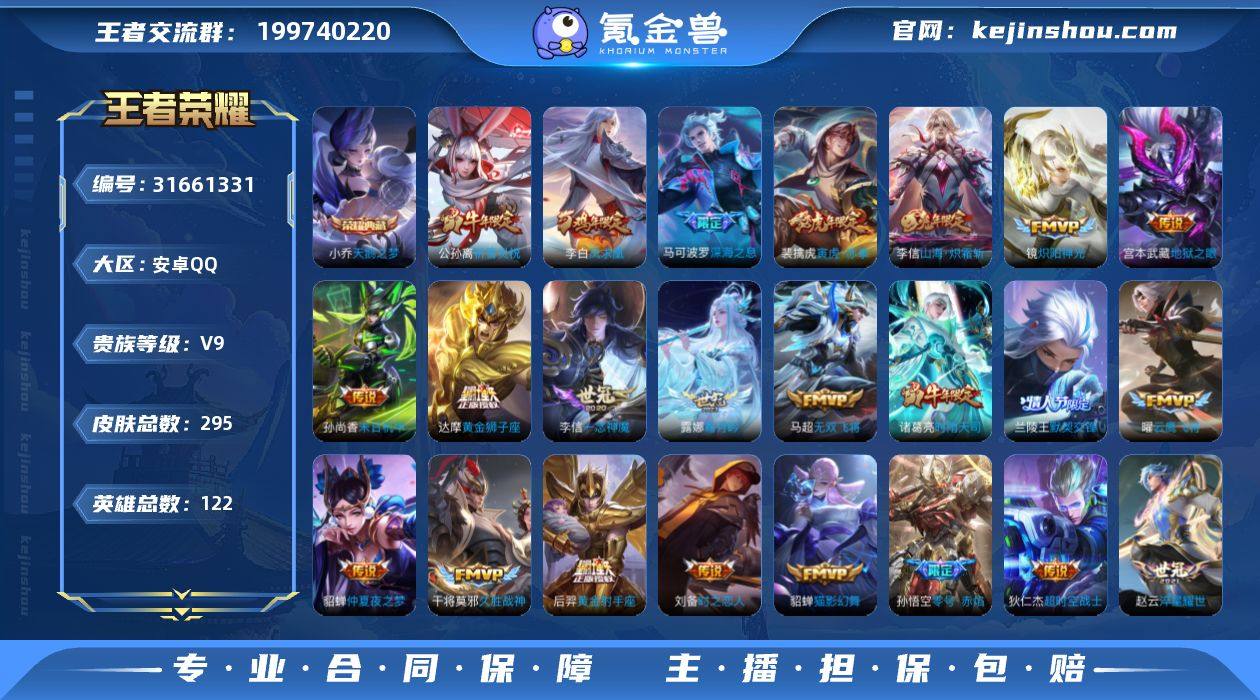 实名: 可修改 贵族等级: V9 英雄数: 122 皮肤数: 295 荣耀水晶: 天鹅之梦 传说皮: 黄金狮子座,黄金射手座,冠军飞将,云鹰飞将,绛天战甲,猫影幻舞,久胜战神,炽阳神光,一念神魔,末日机甲-孙尚香,地狱火,仲夏夜之梦,零号·赤焰,地狱之眼,飞鸢探春,胖达荣荣,时之恋人-刘备,淬星耀世,超时空战士-狄仁杰,挚爱之约,无双飞将,山海·炽霜斩,霜月吟 限定皮: 遇见飞天,李小龙,祈雪灵祝,游园惊梦,梁祝,御风骁将,时雨天司,神威,飞衡,青春决赛季,冰霜恋舞曲,凤求凰,瑞麟志,朱雀志,默契交锋-兰陵王,一生所爱,如梦令-后羿,默契交锋-花木兰,高山流水,孙行者,猪悟能,傲雪梅枪,寅虎·赤拳,深海之息,五谷丰年