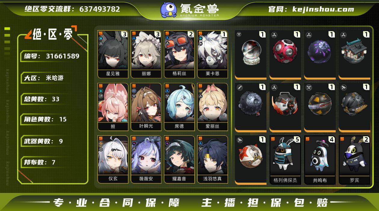 冒险等级:58 总黄数:33 五星角色数:15 菲林底片数量:6 菲林数量:1142 加密母带数量:1 3命星见雅,3命丽娜,2命格莉丝,1命莱卡恩,0命叶瞬光,0命照,0命席德,0命爱丽丝,0命仪玄,0命薇薇安,0命耀嘉音,0命浅羽悠真,0命莱特,0命猫又,0命珂蕾妲 6命赛斯,6命露西,6命苍角,6命派派,6命比利,6命安比,6命妮可,6命安东,6命可琳,5命本,3命潘引壶,1命真斗,0命波可娜 1精云霓孤光,1精十方锻星,1精飞鸟星梦,1精霰落星殿,1精啜泣摇篮,1精嵌合编译器,1精硫磺石,1精拘缚者,1精燃狱齿轮 5精格列佛探员,4精共鸣布,2精罗宾,1精芽芽,1精鲨牙布,1精巴特勒,1精插头布 百里香之海,狡黠甜心,晴澜双迹套装,漪光夜曲
