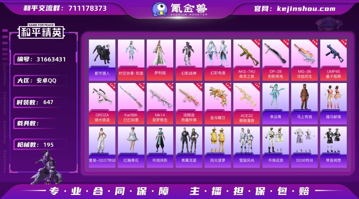 实名:可二次实名 是否支持人脸包赔:支持 粉装数量:4 特效枪数量:10 时装数:647 枪械数:195 都市猎人 幻彩电音,幻影战神,时空协奏·和音,萨利娅 五级AKS-74U-森灵之息,五级DP-28-豹影疾电,五级MG-36-沧焰双生,五级GROZA-镜光银凌,五级Kar98K-巳巳如意,五级MK14-甜梦熊击,五级汤姆逊-热量炸弹,五级UMP45-量子极限,二级信号枪-金乌曜日,一级ACE32-萌骑漫游 狙击之神,马上有钱,幸运青,福马献瑞,红釉青花,SS37特训,雨过天青,玲珑侠影,青翼流星,阳光菠萝,雪国风尚,画境星梦,琴音绮想,书海巡游,SS36特训,炫彩糖果,粉黛兰香,萌鸡速递,错位像素,风迹短诗,秘语星愿,SS35特训,午间小调,元气之梦,漫游都市,薄荷星砂,云魄琉璃,狂鲨锋刃,凌霄紫焰,擎苍青焰,SS34特训套装,游乐,朱霞炽焰,Alan Walker,暗影哥特,冰冻风暴,缤纷果语,滨海厨神,冰河战士,白糯汤圆,白色伏地魔,白熊同盟,彩虹兔,雏菊兔兔,长空猛禽,潮流炫酷,春日漫步,创世·幻影,纯真浪花,顶瓜瓜,蝶变,大橘大利,都市丽猫,都市猎人,都市魅力,粉恋花,风舞幻音,龟仙人,海岛探路者,红红火火,湖蓝色名流,憨乐熊二,幻世保卫者,黑色伏地魔,黄色伏地魔,黄色名流,黄色运动,红色运动,幻世战舞者,幻影公爵,幻影武者,酒红色名流,橘黑制服,竞技达人朋克,竞技名士,极速光影,街头潮人,街头风暴,狂战萌兔,蓝冰羽,蓝彩潮人,拉斐尔,烈火街头,龙魂突击队,猎鹰,萝兰蝴蝶,浪漫天命,蓝色运动,莱茵河畔,恋语绒绒,冷焰舞者,Mark.06,漫步者,摩登魅猫,猛禽,棉花软糖,魅力单车,曼妙人鱼,弄潮海豚,破蛋小黄鸡,破晓战魂,绮丽涂鸦,青年教官,青涩时光,青团波波,俏兔智灵,清新柠檬,青羽突袭者,云朵鹅,绒宝小鹅,热情海星,人气偶像,双彩圣灵,生化防暴队,深蓝色名流,森林游猎者,SS28特训,SS29特训,SS30特训套装,SS31特训套装,SS32特训套装,SS33特训套装,巳巳如意,特殊使命,糖糖葫芦,特训学院,完美偶像,王牌教练,迅捷狂鲨,虚空漩涡,雪绒豹,旭日情侣,夏日倾情,雪山精英,星途旅人,小熊娃娃,雪鹰学院,耀粉歌者,夜瞳黯灵,玉兔迎春,鹰眼刺客,鱼渊荷华,燕燕于飞,异域银装,战地督导,智谋强哥,紫幽梦 炫彩糖果降落伞,炫彩糖果飞行器,雀灵庇佑飞行器,祥瑞起舞飞行器,幻彩电音降落伞,幻影战神降落伞,千金淑猫降落伞,星穹咏叹调降落伞,荧海星豚降落伞,樱桃泡泡降落伞,智耀战神降落伞,最终圣卫者降落伞 卖家说:有全套金羽, TT队服也有,还有热门狼尾,还有300扭弹碎片