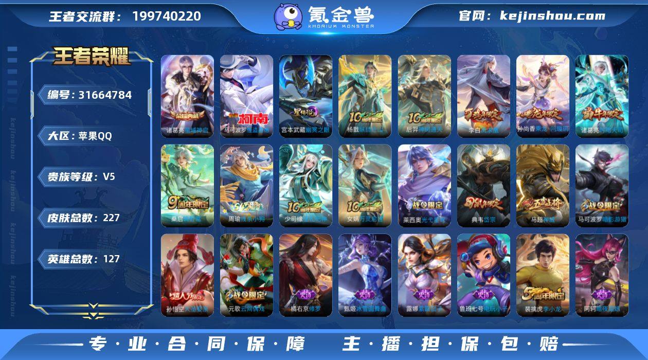 【V7 英雄数量:126 皮肤数量:222 荣耀典藏:1个 珍品传说:1个星传说:1个 传说皮肤:6个 稀有限定:7个 皮肤价值:159252】