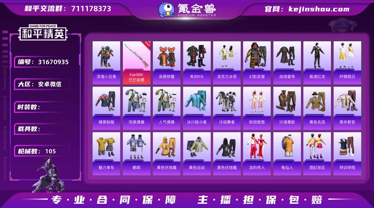 CH158+【安卓V区-传奇印记双字ID-权威小番茄-2粉装-2特效枪-45点地铁天赋-深海小丑鱼-暗影哥特-呆萌虾蟹】安卓V区-可二次-2粉装-2特效枪-28223热力值-3王牌印记-101套装-103枪皮【优质套装】: 时光之吻 羊梦糖心【特效枪等级】:Kar98K-巳巳如意(五级- Kar98K-巳巳如意)【优质武器皮肤】: Kar98K-巳巳如意【稀有武器皮肤】: Kar98K-巳巳如意 PKM-紫幽梦 Mk14-紫幽梦 蜜獾-乌木金纹 S1897-紫幽梦 P92-紫幽梦 M416-糯团青竹 AKM-龙的传人 SCAR-L-炫彩节奏 AUG-耀粉歌者 AUG-天降萌叽 QBZ-彩虹符号 AC-VAL-天降萌叽 AC-VAL-乌木金纹 AMR-乌木金纹 VSS-彩虹符号 Mini14-穿刺龙虾 UZI-红色方程式 UZI-啾咪啾咪 UMP45-生命誓言 汤姆逊-天降萌叽 MP5K-乌木金纹 P90-乌木金纹 S686-生命誓言 S12K-玩趣呆呆 M249-彩虹符号 MG3-幻世战舞者 平底锅-空岛之星 破片手榴弹-呆爆全场 AUG-异域银装 M24-樱桃泡泡 野牛-燕燕于飞 M200-乌木金纹 SPAS-12-燕燕于飞 蝎式手枪-燕燕于飞 十字弩-异域银装 Vector-燕燕于飞 十字弩-燕燕于飞 P90-巳巳如意 破片手榴弹-巳巳如意【其他套装】: 蓝冰羽 恋语绒绒 樱梦幻音 时光之吻 羊梦糖心 暗影哥特 深海小丑鱼 龟仙人 异域银装 白糯汤圆 街头风暴 鱼渊荷华 燕燕于飞 战术大师 巳巳如意 元素星魂 福星高照 龙的传人 白熊同盟 特训学院 猎鹰 青年教官 橘黑制服 红色运动 黄色运动 蓝色运动 黄色伏地魔 白色伏地魔 冰川格斗者 酒红色名流 湖蓝色名流 黄色名流 顽皮玉兔 绯格组合 空岛之星 黑色伏地魔 竞技名士 深蓝色名流 猛禽 长空猛禽 粉团憨憨 街头潮人 冷焰舞者 魅力单车 灼焰舞者 战地督导 青涩时光 极速红龙 沙漠毒蛇 红熊茄茄 完美偶像 人气偶像 幻影武者 破蛋小黄鸡 蓝彩潮人 绮丽涂鸦 竞技达人朋克 海岛探路者 破晓战魂