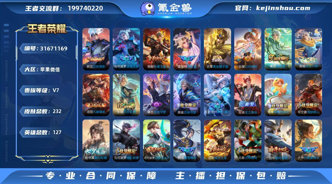 AL681511 【特价野王号微信一切正常 韩信弑枪猎影传说皮肤:达摩黄金狮子座,铠曙光守护者,杨戬永曜之星,夏洛特浮生妄,云缨幻光神枪,马可波罗妄想实况,桑启鸣野蒿,马可波罗深海之息】 皮肤数232 传说皮肤数7 史诗皮肤数71 英雄数127 营地id1720533193 贵族等级【文本】贵族7级 【贵族7级】 荣耀典藏1 内测皮肤2 年限皮肤5 限定皮肤71 赛季限定16 史诗皮肤73 战令限定24 勇者皮肤107 其他皮肤43 荣耀典藏:韩信弑枪猎影; 内测皮肤:高渐离玩趣恶龙,孙尚香蔷薇恋人; 年限皮肤:杨戬永曜之星,后羿辉光之辰,吕布御风骁将,孙悟空美猴王,马可波罗山海玄木吟; 限定皮肤:元歌无心,高渐离玩趣恶龙,女娲万灵启世,元歌云间偶戏,大乔白鹤梁神女,杨戬永曜之星,后羿辉光之辰,鬼谷子克喵,白起死霸装,姬小满小满鸭,蒙犽狂想玩偶喵,杨戬潮玩骑兵,百里守约雪豹霜爪,狂铁龙之律动,苏烈春野闲踪,钟馗虚灵犬护,夏洛特浮生妄,马可波罗暗影游猎,牛魔星界战将,马超访茗客,孙膑茶境仙,太乙真人谧流熔炉,马可波罗妄想实况,百里守约百相守梦,老夫子百相守梦,吕布逐霄战戟,裴擒虎李小龙,桑启鸣野蒿,百里玄策原初追逐者,李元芳银河之约,孙悟空神迹守卫,亚连破空之剑,东皇太一噬灭天穹,李白谪仙醉月,姜子牙天穹之誓,钟馗神迹守卫,镜青焰无极,孙尚香蔷薇恋人,项羽苍威无极,刘邦剑破天穹,沈梦溪龙舞盛年,伽罗琥珀纪元,吕布猎兽之王,嫦娥漠中幻影,高渐离燃音魔法,狄仁杰魔术师,妲己灵卜魔法,鬼谷子天穹祈灯,云中君纤云弄巧,蒙恬荣光圣徽,嫦娥拒霜思,蒙犽百解令,司空震地狱燃心,韩信傲雪梅枪,马可波罗深海之息,阿古朵江河有灵,赵云皇家上将,艾琳流音漫舞,张良古海寻踪,赵怀真鹤归松栖,吕布御风骁将,孙悟空美猴王,鲁班大师探海日志,狄仁杰阴阳师,项羽海滩派对,沈梦...