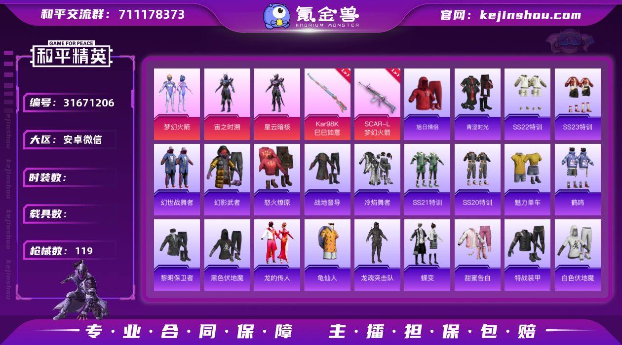 CH167+【双字ID安卓V区-5粉装-3特效枪-4角色-2B战斗服-甜心蒙太奇-懒洋洋-42点地铁天赋-3飞行器】安卓V区-可二次-5粉装-3特效枪-34497热力值-6王牌印记-84套装-117枪皮【优质套装】: 梦幻火箭 异瞳寒姬 绝对恒星 星云暗核 宙之时溯【特效枪等级】:Kar98K-巳巳如意(五级- Kar98K-巳巳如意)SCAR-L-梦幻火箭(五级- SCAR-L-梦幻火箭)【优质武器皮肤】: Kar98K-巳巳如意 SCAR-L-梦幻火箭【稀有武器皮肤】: DBS-乌木金纹 Kar98K-巳巳如意 UZI-冰河战士 M16A4-冰河战士 20-H-乌木金纹 SCAR-L-梦幻火箭 蜜獾-乌木金纹 PKM-啾咪啾咪 M416-红色方程式 M416-蓝色火焰 AKM-四圣焕新 AKM-龙的传人 SCAR-L-炫彩节奏 M16A4-蓝色火焰 GROZA-懵萌河马 AUG-耀粉歌者 QBZ-原初圣火 QBZ-彩虹符号 M762-镭射皇者 M762-牛气冲天 M762-天降萌叽 Mk47-乌木金纹 G36C-懵萌河马 G36C-六号树人 AC-VAL-天降萌叽 AC-VAL-快闪甜心 AC-VAL-乌木金纹 蜜獾-天降萌叽 Kar98K-梦幻火箭 Kar98K-红色方程式 Kar98K-彩虹符号 AWM-乌木金纹 AWM-鎏金朋克 AWM-焰鹰斗篷 AWM-飒粉甜心 莫辛纳甘-懵萌河马 AMR-乌木金纹 SKS-夜幕颂歌 SKS-炫彩节奏 VSS-镭射皇者 MG3-乌木金纹 MG3-摩登王国 PKM-懵萌河马 PKM-蜜语绒猫 P18C-原初圣火 沙漠之鹰-绝色倾城 沙漠之鹰-快闪甜心 TMP-9-江南烟雨 大砍刀-万古烈焰 平底锅-空岛之星 平底锅-原初圣火 平底锅-光之冒险 平底锅-懵萌河马 平底锅-快闪甜心 平底锅-镭射皇者 平底锅-焰鹰斗篷 突击盾牌-万古烈焰 破片手榴弹-呆爆全场 AUG-异域银装 M200-乌木金纹 SPAS-12-乌木金纹【其他套装】: 梦幻火箭 2B战斗服款 恋语绒绒 异瞳寒姬 绝对恒星 星云暗核 宙之时溯 龟