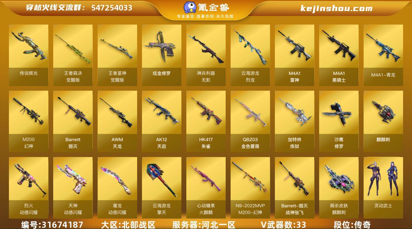 【自带包赔 最高三倍】:北部战区:河北一区-LV97-传奇2-33V-2王者武器数-3炫金武器数 【传说武器】:传说辉光 【热门武器】:传说辉光,HK417-朱雀,加特林-炼狱,金色蔷薇-空,金刚伞,M4A1-青龙,M200-幻神,M4A1-黑骑士,QBZ03-金色蔷薇,沙鹰-修罗 【王者炫金武器】:炫金骑士,炫金武士,炫金修罗 【音效卡】:QBZ03-金色蔷薇音效卡 【皮肤】:幻神-宠儿-2021MVP,火麒麟-心动糖果,毁灭-战神张飞,M200-幻神-黄忠皮肤,M200-幻神-N9-2022MVP,麒麟刺-萌杀皮肤 【角色】:灵动武士,瞳,王者沙漠玫瑰(四防),雨棠,奇洋探员,乔伊教练,云海玲珑,暗夜-X,风暴女,嘉年华灵狐,灵狐-花神,灵狐者-X,灵狐者-七夕宝贝,潘多拉-X,斯沃特-X 【人偶武器】:AWM-灵狐-15周年嘉年华,火麒麟-灵狐,金色蔷薇-空,天龙-曼陀罗 【暴走生化】:超级对讲机 【英雄级武器】:AK47-火麒麟*2,AK12-天启,AN94-超新星*2,AWM-天龙,Barrett-毁灭,加特林-炼狱,M4A1-雷神,M4A1-黑骑士,M200-幻神,麒麟刺,沙鹰-修罗,M4A1-青龙,HK417-朱雀,无影-神兵利器,QBZ03-金色蔷薇,烈火-动感闪耀,Barrett-金色蔷薇,王者星神-觉醒版,王者森决-觉醒版,烈龙-云海游龙,天神-动感闪耀,屠龙-动感闪耀,擎天-云海游龙,手雷-动感闪耀,手雷-云海游龙,烟雾弹-幻灵*2 道具、段位等以实际验号为准。如账号因没有维护,赛季更新等不可抗因素发生变化,不属于账号质量问题"