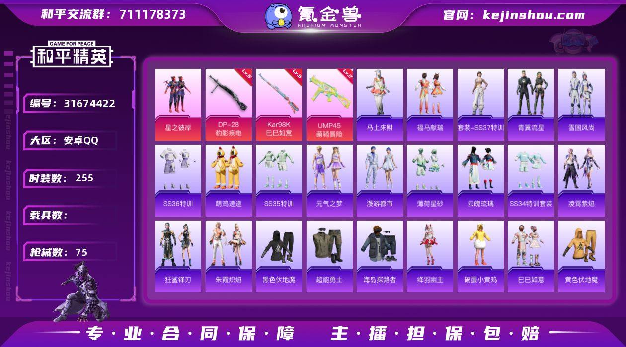 实名:不可二次实名 是否支持人脸包赔:不支持 粉装数量:1 特效枪数量:3 时装数:255 枪械数:75 星之彼岸 五级DP-28-豹影疾电,五级Kar98K-巳巳如意,二级UMP45-萌骑冒险 狙击之神,马上来财,福马献瑞,SS37特训,青翼流星,雪国风尚,SS36特训,炫彩糖果,萌鸡速递,SS35特训,元气之梦,漫游都市,薄荷星砂,云魄琉璃,狂鲨锋刃,凌霄紫焰,SS34特训套装,朱霞炽焰,白糯汤圆,白色伏地魔,长空猛禽,超能勇士,春日漫步,顶瓜瓜,大橘大利,海岛探路者,湖蓝色名流,黑色伏地魔,黄色伏地魔,黄色名流,幻世战舞者,酒红色名流,竞技名士,绛羽幽主,快乐星愿,蓝彩潮人,冷酷挑战者,蓝色运动,恋语绒绒,魅力单车,柠萌假日,破蛋小黄鸡,破晓战魂,绮丽涂鸦,深蓝色名流,SS31特训套装,SS32特训套装,SS33特训套装,巳巳如意,特训学院,完美偶像,星梦畅游,旭日情侣,耀粉歌者,异域银装,灼焰舞者 绝对恒星降落伞,炫彩糖果降落伞,炫彩糖果飞行器,异瞳寒姬降落伞,星之彼岸飞行器,极限特训降落伞 卖家说:不想玩了