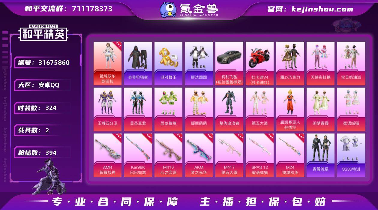 GPZ6608【红色:3 粉色:68 套装:174 枪皮:262 粉枪数:14 粉套装:12 载具:6 珍稀飞行器:8 历史最高段位:超级王牌18星 】热力值:100282 王牌印记:15 绝世印记:1 传奇印记:1 卓越印记:2 游戏等级:71 【珍稀资产】盛世惊鸿-云鸾/精灵之光-露米娜(3)/墨龙九天-敖渊/套装-派对舞王/套装-浪漫天命/套装-雪山精英/套装-暗影哥特/套装-龟仙人/套装-浪漫波比 【粉色套装】套装-梦幻火箭/套装-新星烈龙/套装-银刃赛罗/角色-洛天依/套装-旋转彩虹/角色-小可学妹/角色-呆萌星弥/套装-第五大道/角色-烟云彩露/套装-金丰海韵/角色-樱桃泡泡/角色-女娲灵识 【粉色枪械】M416-心之恋语(7)/M762-甜蜜誓约(5)/AKM-炫紫旋律(7)/SCAR-L-锦绣绵绵(5)/AUG-暖羊咩咩(5)/Kar98K-圣域龙灵(3)/Kar98K-巳巳如意(5)/Kar98K-伏魔团(3)/VSS-烈焰拳霸/Mk14-樱桃泡泡/Mk14-盛世惊鸿(3)/M417-第五大道(3)/AKS-74U-信仰神谕(5)/P90-金丰海韵(7) 【粉色载具】海龙奔腾/路特斯ELETRE(花绽灰)/特斯拉Model 3(珍珠白)/特斯拉Roadster(水滴蓝)/盛世惊鸿摩托车/星梦玉骢 【其他载具】海龙奔腾/路特斯ELETRE(花绽灰)/特斯拉Model 3(珍珠白)/特斯拉Roadster(水滴蓝)/盛世惊鸿摩托车/星梦玉骢 【粉色飞行器】凤舞九天飞行器/太空嘟嘟飞行器/牡丹亭?游园飞行器/圣域金龙飞行器/天之羽翼飞行器/镜域双华-灵镜之阶/曦光华影飞行器/万象金身飞行器 【其他飞行器】空岛之星尾迹/顶峰精英尾迹 【粉色降落伞】春暖花开降落伞/信仰神谕降落伞/垂柳戏鸭降落伞/神秘黑猫降落伞/闪光银龙降落伞/第五大道降落伞/樱桃泡泡降落伞/洛神天依降落伞/甜蜜誓约降落伞/炫紫旋律降落伞/机甲封神降落伞/凝视深渊降落伞/王牌四分卫降落伞/天之羽翼降落伞/青春物语降落伞/江南烟雨降落伞/沙丘之主降落伞/旋转彩虹降落伞/盛世惊鸿降落伞/齐天大圣降落伞/金丰海韵降落伞/潮汐统领降落伞 【...