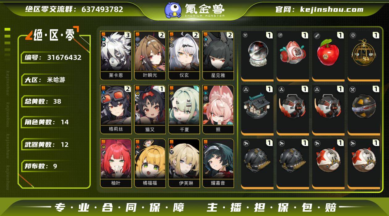 冒险等级:60 总黄数:38 五星角色数:14 菲林底片数量:22 菲林数量:1294 加密母带数量:0 3命莱卡恩,2命叶瞬光,2命仪玄,2命星见雅,2命格莉丝,1命猫又,0命千夏,0命照,0命柚叶,0命橘福福,0命伊芙琳,0命耀嘉音,0命浅羽悠真,0命珂蕾妲 6命潘引壶,6命波可娜,6命露西,6命苍角,6命派派,6命比利,6命安比,6命妮可,6命安东,6命可琳,5命赛斯,4命本 1精半糖雪兔,1精云霓孤光,1精狸法七变化,1精青溟笼舍,1精霰落星殿,1精嵌合编译器,1精硫磺石,1精拘缚者,1精燃狱齿轮 3精芽芽,2精狮耶,2精插头布,1精艾丝弥小姐,1精咔嚓仔,1精格列佛探员,1精阿崔巡查,1精巴特勒,1精左轮布 狡黠甜心,墨形影踪,暖霞拾光,晴澜双迹套装,漪光夜曲 卖家说:虚狩高命配队多,想玩什么随便组,还有很多菲林可以挖,带2个月月卡
