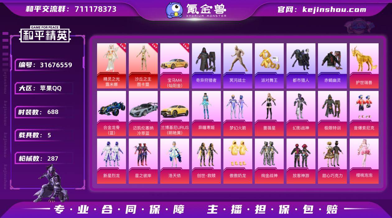 实名:可二次实名 是否支持人脸包赔:支持 粉装数量:18 特效枪数量:20 载具数:5 时装数:688 枪械数:287 冥河战士,奇异狩猎者,赤蝎幽灵,都市猎人,派对舞王 四级精灵之光-露米娜,一级沙丘之主-图卡盟 三级宝马M4(灿阳金) 异瞳寒姬,傲傲奶龙,初号机款机体服,创世·救赎,第五大道,放客神游,幻影战神,极限特训,洛天依,梦幻火箭,蔷薇星,天使彩虹糖,甜心巧克力,绚金战神,新星烈龙,星之彼岸,音爆索尼克,樱桃泡泡 八级AUG-星梦奇缘,七级M416-五爪金龙,六级GROZA-无垠阁,六级UMP45-恐龙拽拽,五级DP-28-豹影疾电,五级AKM-绿萝繁花,五级AKM-梦之光华,五级Kar98K-巳巳如意,五级M762-青锋波束,四级DP-28-暗夜鎏金,四级MG3-梦幻舞会,四级MK14-樱桃泡泡,四级P90-金丰海韵,三级P90-沙丘之主,三级SCAR-L金蛇镇世,三级SCAR-L-青春物语,一级AUG-星之彼岸,一级Groza-香水柠檬,一级P90-能量风暴,一级UMP45-相思残雪 合金龙骨(蓝),护世瑞兽,兰博基尼URUS(明艳黄),迈凯伦塞纳(冷萃蓝) 狙击之神,青翼流星,雪国风尚,SS36特训,冥河战士,奇异狩猎者,炫彩糖果,萌鸡速递,SS35特训,元气之梦,薄荷星砂,凌霄紫焰,擎苍青焰,SS34特训套装,朱霞炽焰,暗影哥特,冰川特警,冰冻风暴,缤纷果语,冰河战士,白色伏地魔,冰爽海盐,贝斯之夜,春光漫游,雏菊兔兔,长空猛禽,超能勇士,春日漫步,赤蝎幽灵,纯真浪花,顶瓜瓜,蝶变,大橘大利,都市猎人,电音精灵,飞驰魅影,绯格组合,飞狐塔尔斯,粉红小猪,粉恋花,粉日山川,飞行日记,龟仙人,光之冒险,贵族骑装,幻彩翩翩,海岛探路者,鹤鸣,湖畔霞光,幻世战舞者,和煦暖阳,湖雨初晴,幻影公爵,幻羽潜行,军刀雅典娜,金戈铁马,惊鸿侠骨,娇憨猪猪,竞技名士,吉莉礼服,街头风暴,锦衣飞扬,空岛之星,快乐星愿,快闪甜心,蓝冰羽,龙的传人,龙魂突击队,冷酷挑战者,萝兰蝴蝶,浪漫波比,猎梦纪元,灵蜜圈圈,浪漫天命,浪漫樱花,龙腾端午,莱茵河畔,恋语绒绒,Mark.06,漫步者,妙红点点,萌黄之夏,魅力单车,麻辣教官,懵萌河马,萌趣咩咩,明日香款战斗服,蜜桃派对,霓虹街区,柠萌假日,牛气冲天,牛气满满,暖心熊熊,派对舞王,破蛋小黄鸡,青春校园,轻风白浪,青涩时光,青团波波,青玉碎影,云朵鹅,荣耀,热情海星,热血青春,日照花林,忍者信条,沙暴袭击者,闪电轻猫,沙漠兵团,神气柴柴,SS19特训,SS20特训,SS21特训,SS22特训,SS23特训,SS24特训,SS25特训,SS26特训,SS27特训,SS28特训,SS29特训,SS31特训套装,SS32特训套装,SS33特训套装,巳巳如意,水银刺客,探宝勇士,TJB追光队服,甜梦熊熊,豚鼠丹丹,特殊使命,糖霜甜心,涂山之恋,糖糖葫芦,特训学院,甜心亚梦,田园牧歌,特战装甲,王牌教练,微雨春柳,小丑鱼,迅捷狂鲨,薰款战斗服,星梦畅游,雪绒豹,夏日音浪,雪兔飞飞,星途旅人,小熊娃娃,虚音幻奏,星影赞美诗,摇滚舞王,摇滚战魂,荧惑魅影,音速流光,夜瞳黯灵,玉兔迎春,野性战心,英勇保护者,鹰眼刺客,焰鹰斗篷,鱼渊荷华,幽夜迷踪,燕燕于飞,异域银装,智谋强哥,照水倚天,紫幽梦 炫彩糖果降落伞,炫彩糖果飞行器,喜羊羊与灰太狼降落伞,镜光幻境飞行翼,梦幻火箭飞行器,齐天大圣飞行器,万象金身飞行器,星之彼岸飞行器,变形金刚降落伞,脆鲨七海降落伞,辉羽雀灵降落伞,幻影战神降落伞,金丰海韵降落伞,金蛇镇世降落伞,极