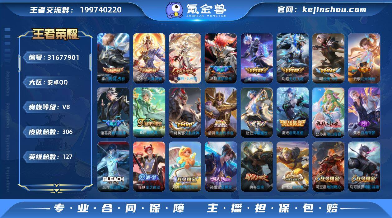 AL681562 【特价305皮李白鸣剑曳影花木兰九霄神辉 传说皮肤:澜愿照九州拓,云缨幻光神枪,桑启鸣野蒿,虞姬启明星使,澜逐花归海,马超琥珀纪元,曜云鹰飞将,干将莫邪久胜战神,马可波罗妄想实况,诸葛亮鹤羽星尊,赵云淬星耀世,马超无双飞将,铠曙光守护者,后羿黄金射手座】 皮肤数306 传说皮肤数13 史诗皮肤数98 英雄数127 营地id1779865077 贵族等级【文本】贵族8级 【贵族8级】 荣耀典藏2 内测皮肤2 年限皮肤5 限定皮肤96 赛季限定24 史诗皮肤99 战令限定30 勇者皮肤137 其他皮肤54 荣耀典藏:李白鸣剑曳影,花木兰九霄神辉; 内测皮肤:姬小满妄想食味,孙尚香蔷薇恋人; 年限皮肤:澜愿照九州拓,马可波罗山海玄木吟,典韦岱宗,百里守约朱雀志,铠青龙志; 限定皮肤:公孙离涂山容容,鬼谷子克喵,白起死霸装,后羿石田雨龙,姬小满小满鸭,澜愿照九州拓,赵怀真器灵浮梦炉,马超访茗客,孙膑茶境仙,太乙真人谧流熔炉,牛魔星界战将,老夫子百相守梦,百里守约百相守梦,吕布逐霄战戟,梦奇顽趣,裴擒虎李小龙,桑启鸣野蒿,虞姬启明星使,亚连破空之剑,孙悟空神迹守卫,东皇太一噬灭天穹,盘古敬我三分,蔡文姬夏日便利店,虞姬夏日便利店,上官婉儿神器万象笔,姜子牙天穹之誓,雅典娜黎明之约,姬小满妄想食味,刘邦剑破天穹,鲁班七号蔬乡物语,李元芳蔬乡物语,沈梦溪龙舞盛年,吕布猎兽之王,马超琥珀纪元,伽罗琥珀纪元,高渐离燃音魔法,嫦娥漠中幻影,妲己灵卜魔法,云中君纤云弄巧,鬼谷子天穹祈灯,蒙恬荣光圣徽,蒙犽百解令,艾琳流音漫舞,司空震地狱燃心,阿古朵江河有灵,张良古海寻踪,戈娅驭风魔法,马可波罗妄想实况,诸葛亮鹤羽星尊,西施玲珑珍味,鲁班大师探海日志,百里玄策原初追逐者,孙悟空至尊宝,裴擒虎擒涛扼浪,暃星界游侠,嫦娥暖冬兔眠,马可波罗山海玄木吟,桑启海...