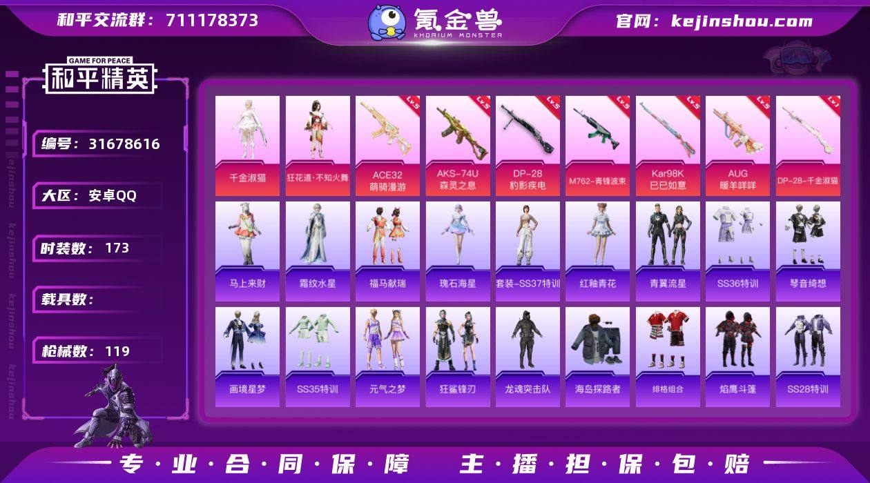实名:不可二次实名 是否支持人脸包赔:不支持 粉装数量:2 特效枪数量:7 时装数:173 枪械数:119 狂花道·不知火舞,千金淑猫 五级ACE32-萌骑漫游,五级AKS-74U-森灵之息,五级DP-28-豹影疾电,五级AUG-暖羊咩咩,五级Kar98K-巳巳如意,五级M762-青锋波束,一级DP-28-千金淑猫 狙击之神,马上来财,福马献瑞,瑰石海星,霜纹水星,红釉青花,SS37特训,青翼流星,画境星梦,琴音绮想,SS36特训,SS35特训,元气之梦,狂鲨锋刃,缤纷果语,冰河战士,雏菊兔兔,长空猛禽,纯真浪花,蝶变,都市丽猫,绯格组合,海岛探路者,湖畔霞光,幻羽潜行,街头风暴,龙魂突击队,萝兰蝴蝶,恋语绒绒,青团波波,热情海星,SS28特训,SS29特训,SS30特训套装,SS31特训套装,糖糖葫芦,香桃花海,星途旅人,焰鹰斗篷,鱼渊荷华,燕燕于飞 辉云木星降落伞,炫彩糖果降落伞,江南烟雨降落伞,千金淑猫降落伞,雪月幻音降落伞 卖家说:时装只有45套,两套粉,九个升级皮,手雷三紫皮,燃烧弹一紫皮,铝热弹一紫皮,平底锅五个紫,撬棍一紫皮,十字驽两个紫皮,战术驽一个紫皮。但由于这号是连体号所以价格会高出一些价格。