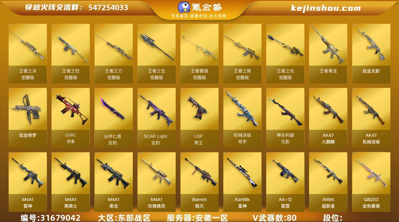 东部战区(安徽一区)ys【精品生化爆破挑战号】【臻选次元套装+挑战6阶BOSS卡122】双传说【传说艾莉莎,传说夜影】80v【kar98K-星神+皮/漫游,神工天巧套装,动感闪耀套装,QBZ03-天罚,ScarLight-玄豹,QBZ03-金色蔷薇+皮/枪娘阿敏,白虎之魄,5烈龙+4修罗+炽芒蝶刃+斯泰尔-蝴蝶+炼狱-迷你小钢,USP-冥王*2,USP-神工天巧,丛林匕首-玄豹,金刚伞,猫猫手套】11王者【AK47-雷暴王者,王者之决,王者之力,王者之光,王者青龙,王者霜心,王者之势,王者之烈,王者蔷薇,王者之击,炼狱-悦蓝】3炫金【炫金无影,炫金骑士,炫金修罗】8角色【四防传说艾莉莎,晴雅,鹰,王者-瞳-闭月羞花,王者葵-翩若惊鸿,零·纪元,乔伊教练,修道士】4音效【ScarLight-白虎音效卡,M4A1-黑骑士音效卡,M4A1-雷神音效卡,Barrett-碧霄极光音效卡】26皮【雷神-宋雨琦,星神-漫游,金色蔷薇-枪娘阿敏,毁灭-枪娘格雷姐妹,毁灭-风暴,火麒麟-心动糖果,毁灭-直播专属,M4A1-战神赵云,火麒麟-华夏之心,M4A1-黑龙-361,炼狱-星空,火麒麟-CF STAR,天龙-CF STAR】挑战枪【爆炎激光-超越MAX,集束激光-超越MAX,寒冰征服者-超越Max,AA12-擎天柱III,】小人枪【炼狱-迷你小钢,斯泰尔-蝴蝶,雷神-小红,火麒麟-零·纪元】【VIP4】截图展示段位不代表实际段位 如赛季更新等不可抗拒因素发生变化、时限道具不保证所剩时间