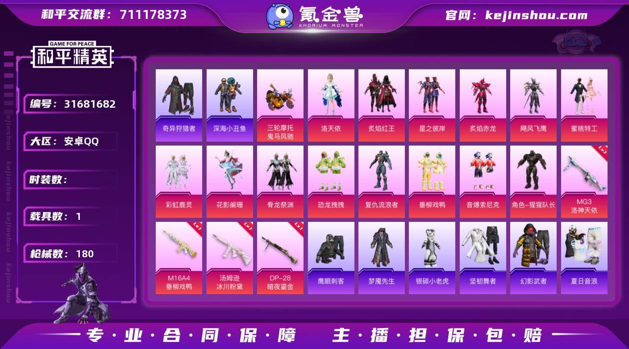 次】【因赛季更新游戏段付以上号为准!】 安卓Q-2稀有1载具14粉装4特效枪21热门155套装180枪皮 7印记 历史超级王牌13星 【2稀有】 奇异狩猎者 SCAR-L-粉色回忆 【1载具】 鬼马风驰 【14粉装】 洛天依 猩猩队长 垂柳戏鸭 炙焰红王 星之彼岸 音爆索尼克 炙焰赤龙 飓风飞鹰 蜜桃特工 恐龙拽拽 骨龙祭渊 彩虹鹿灵 花影阑珊 复仇流浪者 【4特效枪】 汤姆逊-冰川粉黛 (3级) DP-28-暗夜鎏金 (6级) M16A4-垂柳戏鸭 (7级) MG3-洛神天依 (6级) 【21热门】 小丑鱼 龟仙人 雪山精英 梦魇先生 鹰眼刺客 银碳小老虎 深海小丑鱼 童话森林 裁决冥王 暗夜契约 迪迦奥特曼 团圆交子 瑞龙福将 纯白誓言 豚鼠丹丹 破蛋小黄鸡 黑色刀锋 M762-瑞龙福将 M249-古堡领主 汤姆逊-林间仙鹿 GROZA-林间仙鹿 【1飞行器】 梦幻火箭飞行器 【3头盔】 童趣迷兔头盔 梦幻火箭头盔 甜心宝贝头盔 【7背包】 银河战甲背包 九霄背包 精灵迷巫背包 梦幻火箭背包 深海曼妙背包 甜蜜誓约背包 马卡龙背包