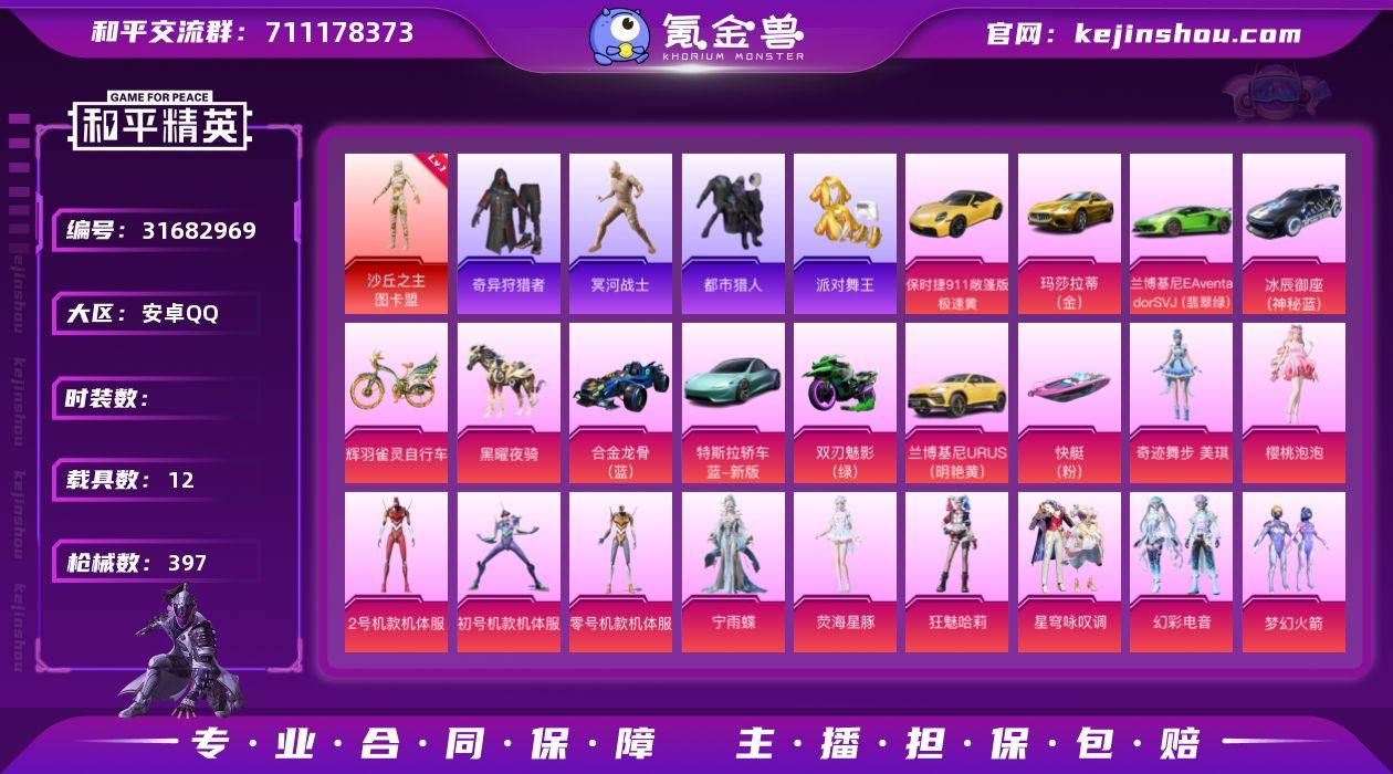 游戏好友(可与q好友同玩)】【图卡盟 艾丽娅 木乃伊 巡查衣 都市 金鞋 3螳螂 小丑 特训 4把计数枪 星梦奇缘aug】c25719-【无二次】【因赛季更新游戏段付以上号为准!】 安卓Q-2红装7稀有13载具37粉装29特效枪45热门300套装397枪皮 15印记 历史绝世王牌19星 【2红装】 暮色玫影-艾丽娅 (1级) 沙丘之主-图卡盟 (2级) 【7稀有】 木乃伊 奇异狩猎者 巡查衣 AKM-缤纷海域 都市猎人 派对舞王 派对舞王(金靴子) 【13载具】 暮色幽蹄 玛莎拉蒂金色 保时捷911敞篷版(极速黄) 冰辰御座(神秘蓝) 兰博SUV黄色 兰博SVJ绿色 特斯拉R水滴蓝 合金龙骨蓝色 黑曜夜骑 双刃魅影绿色 塞莎霓虹粉 (1级) 辉羽雀灵自行车 空客蔚蓝之翼僚机 【37粉装】 红螳螂 黄螳螂 紫螳螂 狂魅哈莉 梦幻火箭 蝶舞迷情 宁雨蝶 奇迹舞步美琪 洛天依 金风玉露 荧海星豚 异瞳寒姬 樱桃泡泡 金曜白虎 星穹咏叹调 怪诞乔克 冰炎战车 幻影战神 紫钛骑兵 幻彩电音 极限特训 新星烈龙 极致幻想 潮汐统领 草莓生巧 绚金战神 星之彼岸 恐龙拽拽 桀骜红莲 铁血龙王 显圣真君 暗夜玫瑰 沙场疾风 吟月归客 蓝莓炮弹 海渊国主 碧影闪光 【31特效枪】 M416-五爪金龙 (7级) M416-心之恋语 (4级) P90-魔童闹海敖丙 (3级) AKM-炫紫旋律 (3级) AKS-74U-森灵之息 (4级) AKS-74U-星穹咏叹调 (4级) Kar98K-巳巳如意 (5级) M24-暗星紫秘 (4级) Famas-翎光蝶翼 (3级) MG-36-幻彩电音 (5级) Vector-最终圣卫者 (3级) DP-28-豹影疾电 (5级) AUG-圣斗士星矢 (5级) AUG-星梦奇缘 (3级) ARX-无垠阁 (4级) 蜜獾-异瞳寒姬 (4级) Mk14-樱桃泡泡 (1级) Mk14-甜梦熊击 (5级) M762-激战未来 (5级) 汤姆逊-热量炸弹 (5级) SLR-暗夜玫瑰 (4级) MG3-洛神天依 (5级