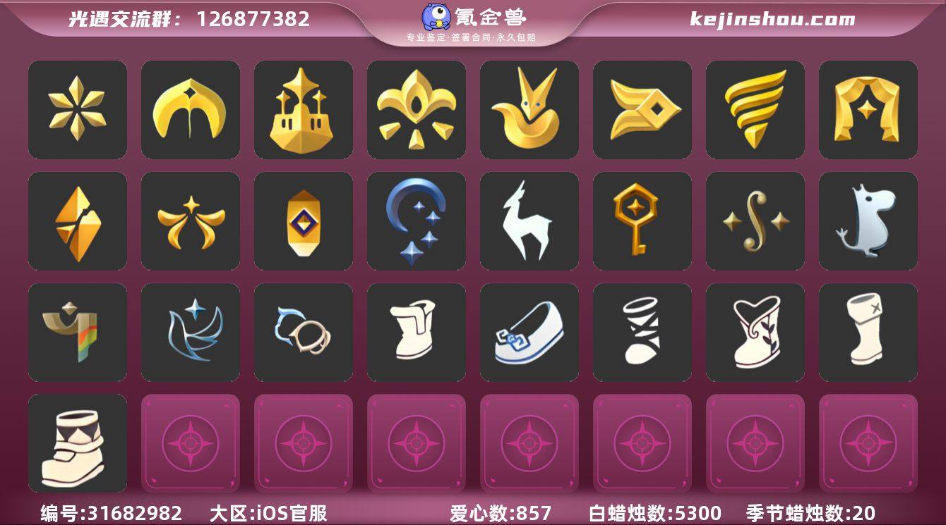蜡烛数量:5300 爱心数量:857 季节蜡烛数量:20 翼数量:213 音韵季,圣岛季,梦想季,集结季,小王子季,风行季,潜海季,表演季,破晓季,欧若拉季,追忆季,夜行季,九色鹿季,筑巢季,二重奏季,姆明季,彩染季,青鸟季,双星季 蓝色雪地靴,盘扣平底鞋,刀疤士兵鞋子,青鸟伐木不舍鞋子,寻宝长靴,彩染挑衅艺伎鞋子 卖家说:17季节白鸟徽章号