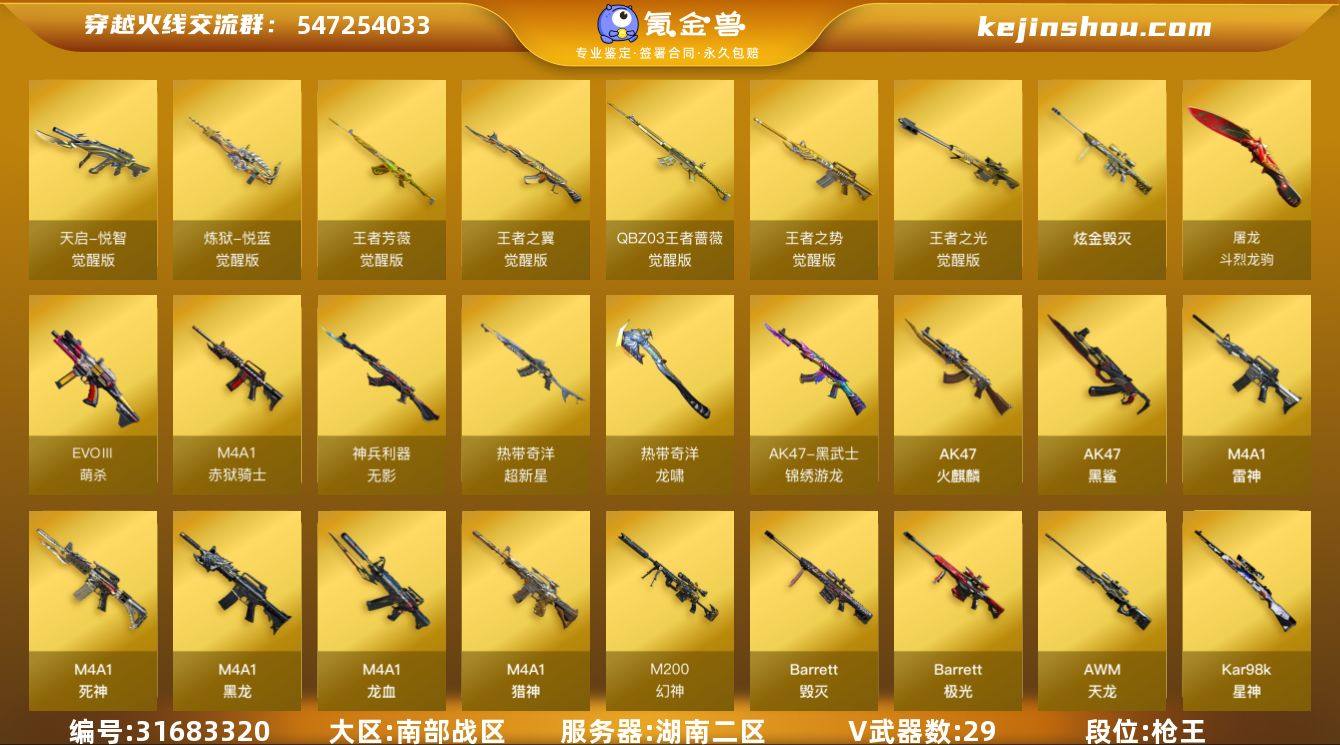 段位:枪王 VIP等级:VIP5 V武器数:29 王者武器数:7 炫金武器数:1 天启-悦智-觉醒版,炼狱-悦蓝-觉醒版,王者芳薇-觉醒版,王者之翼-觉醒版,QBZ-03-王者蔷薇-觉醒版,王者之势-觉醒版,王者之光-觉醒版 炫金毁灭 EVOⅢ-萌杀,屠龙-斗烈龙驹,M4A1-赤狱骑士,无影-神兵利器,超新星-热带奇洋,龙啸-热带奇洋,AK47-黑武士-锦绣游龙,AK47-火麒麟,AK47-黑鲨,M4A1-雷神,M4A1-死神,M4A1-黑龙,M4A1-龙血,M4A1-猎神,M200-幻神,Barrett-毁灭,Barrett-极光,AWM-天龙,Kar98k-星神,AA-12-雷霆,AN94-超新星,HK417-朱雀,QBZ03-金色蔷薇,9A91-烈火,屠龙,龙啸,麒麟刺,天神,龙啸-烈火龙威,擎天-云海游龙 王者炫 关小雨,零·纪元,魅影,隼,审判者,王者影豹,战地猎狐 云海游龙音效卡 卖家说:【m200幻神+幻神电流骇客皮肤】【98k星神+星神破竹皮肤】【hk朱雀+朱雀音效卡】【qbz金色蔷薇+金色蔷薇巅峰荣耀皮肤】 【觉醒王者qbz】【觉醒王者芳薇】【觉醒王者之光】60v5王者