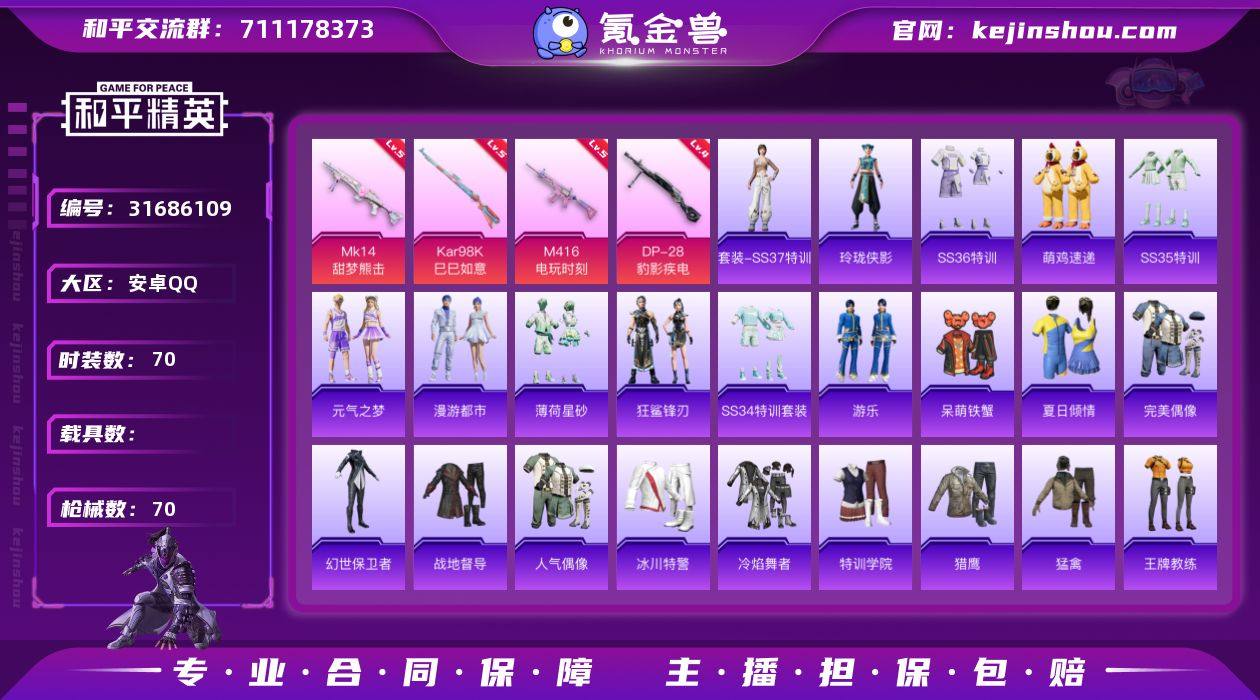 "H6810有二次 安卓Q-段位钻石 40级 1印记 70套装70枪皮 【4特效枪】 M416-电玩时刻 5级 Mk14-甜梦熊击 5级 DP-28-豹影疾电 4级 Kar98K-巳巳如意 5级 【热门】 4AM战队服 角色-海琴烟 浪漫天命 清新柠檬 超能勇士 元气之梦 鹤鸣 夏日倾情 旭日情侣 绯夜呢喃头饰 暮色狼梦头饰