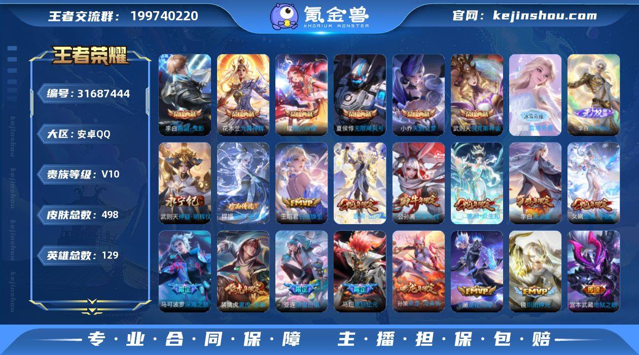 贵族等级:V10 典藏皮肤数:6 珍品无双皮肤数:0 无双皮肤数:3 珍品传说皮肤数:1 传说皮肤数:60 史诗皮肤数:156 皮肤数:498 英雄数:129 段位:荣耀王者 卖家说:二次实名在冷却期,冷却期过后可二次,期间包扫脸人脸认证