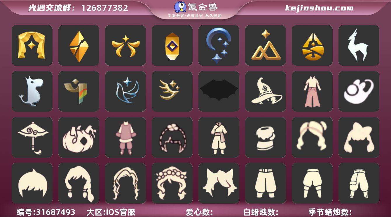 账号类型: 邮箱账号 季节已毕业: 表演季,破晓季,欧若拉季,夜行季,追忆季,拾光季,归巢季,九色鹿季,姆明季,彩染季,青鸟季,迁徙季 完成地图: 无 礼包: 蝙蝠套,巫师,牛仔裤,兔子鞋,红伞,南瓜,新年裤,四叶草,暗彩装扮,雪人鞋 裤子: 武士裤,白棉裤,搓澡巾,灯笼裤 面具: 黄鼠狼,红狐狸,龙头,兔头 面饰: 星星眼镜 项链: 铃铛,围巾 发型: 蝴蝶结,正太,花环,公主,书虫,虚荣,猫耳 头饰: 花环,蝴蝶结,草帽,红色耳机 斗篷: 白金,红金,黑金,白鸟斗,花瓣斗篷,樱花斗,海洋斗,彩虹斗 配饰: 雨伞,排箫,高音钢琴,吉他,笛子