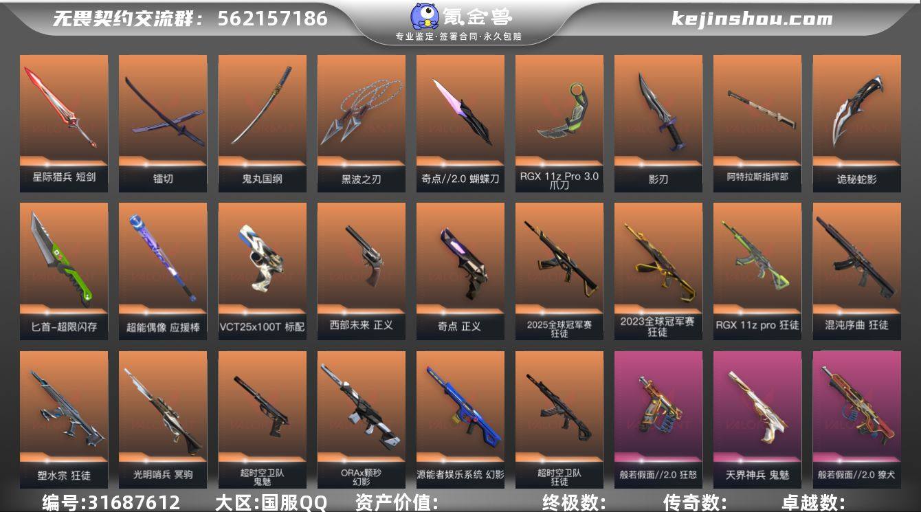 【套装】:西部未来套装,源能者娱乐系统套装,掠影套装 【英雄】:幻棱,炼狱,维斯,暮蝶,钛狐,壹决,铁臂,捷风,雷兹,幽影,不死鸟,贤者,猎枭,蝰蛇,零,芮娜,奇乐,尚勃勒,霓虹,斯凯,夜露,星礈,K/O,海神,盖可,黑梦,钢锁 【近战 武器】:近战武器-无畏契约GO!第一卷 苦无,近战武器-澄湖潋滟,近战武器-鬼丸国纲,近战武器-珍珠棘贝 短剑,近战武器-流星兵团 短剑,近战武器-未来开拓者,近战武器-超能偶像 应援棒,近战武器-超限闪存 匕首,近战武器-堕天遗武 仪式匕首,近战武器-盖亚之愠,近战武器-钢轨卫士 战锤,近战武器-弧光异彩 军刀,近战武器-荒土机兵 热能刀,近战武器-机动狂飙 战刀,近战武器-街机高手,近战武器-沙尘幻旅 匕首,近战武器-影刃,近战武器-诡秘蛇影 军刀,近战武器-神圣领域 战刀 【狂徒】:狂徒-混沌序曲,狂徒-塑水宗,狂徒-RGX 11z Pro,狂徒-堕天遗武,狂徒-掠影,狂徒-紫阙金琅,狂徒-超能偶像,狂徒-钢轨卫士,狂徒-弧光异彩,狂徒-荒土机兵,狂徒-流星兵团,狂徒-沙尘幻旅,狂徒-诡秘蛇影 【幻影】:幻影-源能者娱乐系统,幻影-千灵华绽,幻影-西部未来,幻影-侦察力量,幻影-超限闪存,幻影-噬源兽防卫工程,幻影-珍珠棘贝,幻影-神圣领域,幻影-聚合之力,幻影-纳米打击,幻影-战术小伙伴,幻影-末日之翼,幻影-西部未来 【戍卫】:戍卫-掠影,戍卫-紫阙金琅,戍卫-超能偶像,戍卫-钢轨卫士,戍卫-珍珠棘贝,戍卫-彩梦之城,戍卫-浮光跃金,戍卫-萌彩剪影,戍卫-逆冲蛮牛,戍卫-战术熊与伙伴们,戍卫-月球哨兵,戍卫-折光棱晶 【獠犬】:獠犬-源能者娱乐系统,獠犬-弧光异彩,獠犬-神圣领域,獠犬-采蜜小蜂队,獠犬-复古浪潮,獠犬-胡桃狂想,獠犬-模拟赫兹,獠犬-逆冲蛮牛,獠犬-战术小伙伴 【冥驹】:冥驹-源能者娱乐系统,冥驹-堕天遗武,冥驹-掠影...
