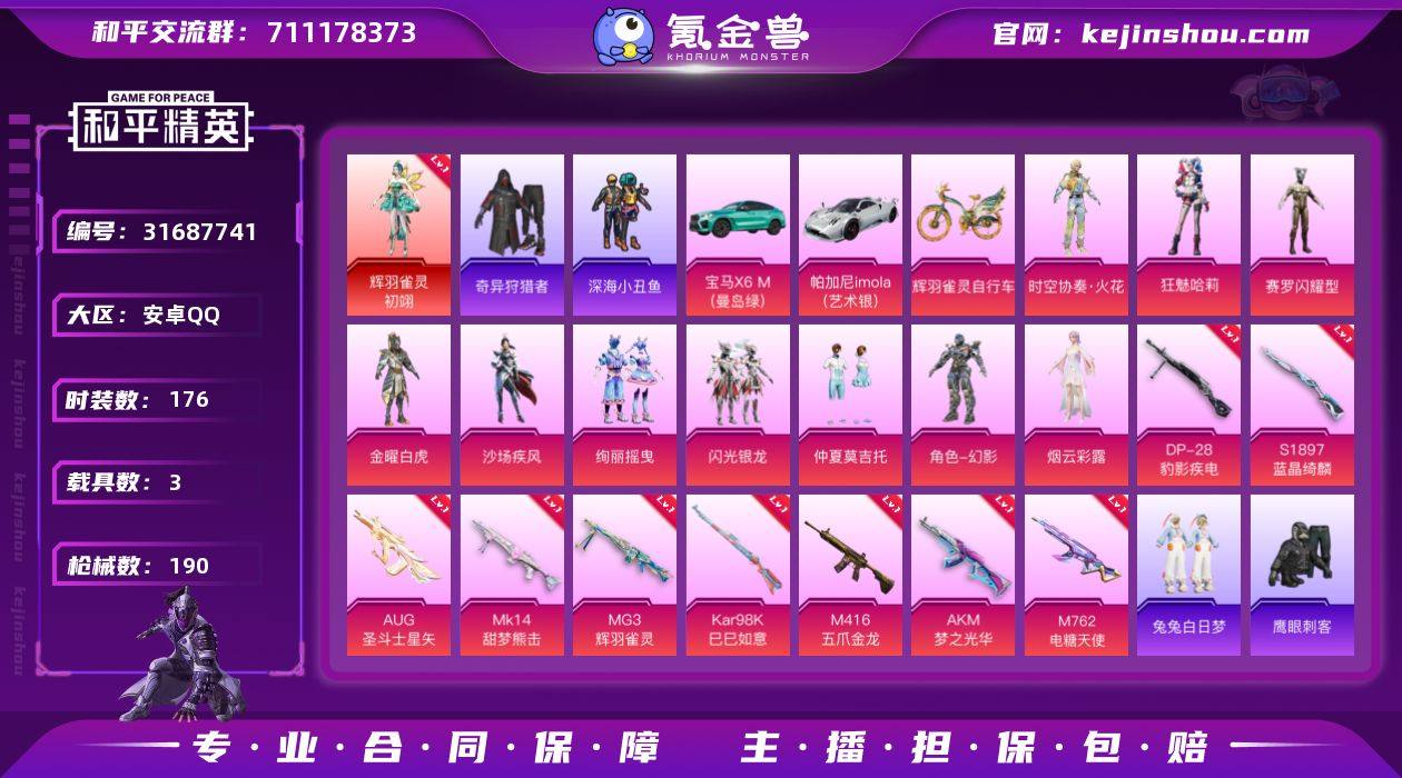安卓 手Q-1神装-6粉装-6特效枪-5载具-1粉色飞行器-54407热力值-6王牌印记-117套装-148枪皮 【红色神装等级】:角色-青焰关公(二级) 【红色角色神装】:角色-青焰关公 【热门品类】:套装-深海小丑鱼,角色-忠猛周仓,角色-忠真马岱,角色-忠义严颜,套装-龟仙人,大砍刀-青龙偃月刀,撬棍-龙胆亮银枪 【粉色套装】:角色-幻影,角色-茉莉星,角色-万古烈焰,角色-宙之时溯,角色-星云暗核,玩偶服-猪猪侠 【粉色枪皮等级】:AKM-绿萝繁花(五级),SCAR-L-万古烈焰(九级),M416-电玩时刻(五级),GROZA-镜光银凌(五级),Kar98K-巳巳如意(五级),DP-28-豹影疾电(五级) 【粉色载具】:宾利BATUR(极速紫),宾利添越(浅瞪羚棕),永恒黄蜂,赤兔,照夜玉狮子 【粉色枪皮】:AKM-绿萝繁花,SCAR-L-万古烈焰,M416-电玩时刻,GROZA-镜光银凌,Kar98K-巳巳如意,DP-28-豹影疾电 【粉色飞行器】:万古烈焰飞行器 【粉色降落伞】:暗夜玫瑰降落伞,齐天大圣降落伞,变形金刚降落伞,万古烈焰降落伞,龙行天下降落伞,精灵梦叶罗丽降落伞,未来领航者降落伞 【稀有套装】:套装-龟仙人,套装-巳巳如意,套装-雏菊兔兔,套装-萝兰蝴蝶,角色-拉斐尔,套装-糖糖葫芦,套装-青团波波,套装-燕燕于飞,套装-鱼渊荷华,角色-风玲,套装-旋风灵鼠,角色-绯色魅影 【稀有枪皮】:AKM-彩虹符号,AKM-生命誓言,AKM-虎虎生威,AKM-霓虹街区,AKM-龙的传人,M16A4-蓝色火焰,SCAR-L-夜灯,SCAR-L-是爱神辣,SCAR-L-红色方程式,M416-糯团青竹,M416-绯红前夜,M416-蓝色火焰,GROZA-彩虹符号,GROZA-影袭,AUG-2P战斗服款,AUG-天降萌叽,QBZ-未来歌姬,M762-瑞龙福将,Mk47-炫光之旅,G36C-暗夜玫瑰,AC-VAL-快闪甜心,蜜獾-天降萌叽,UZI-啾咪啾咪,UZI-天降萌叽,UZI-影袭,UZI-炫彩节奏,UZI-月影灵韵,UMP45-仲夏莫吉托,UMP45-生...