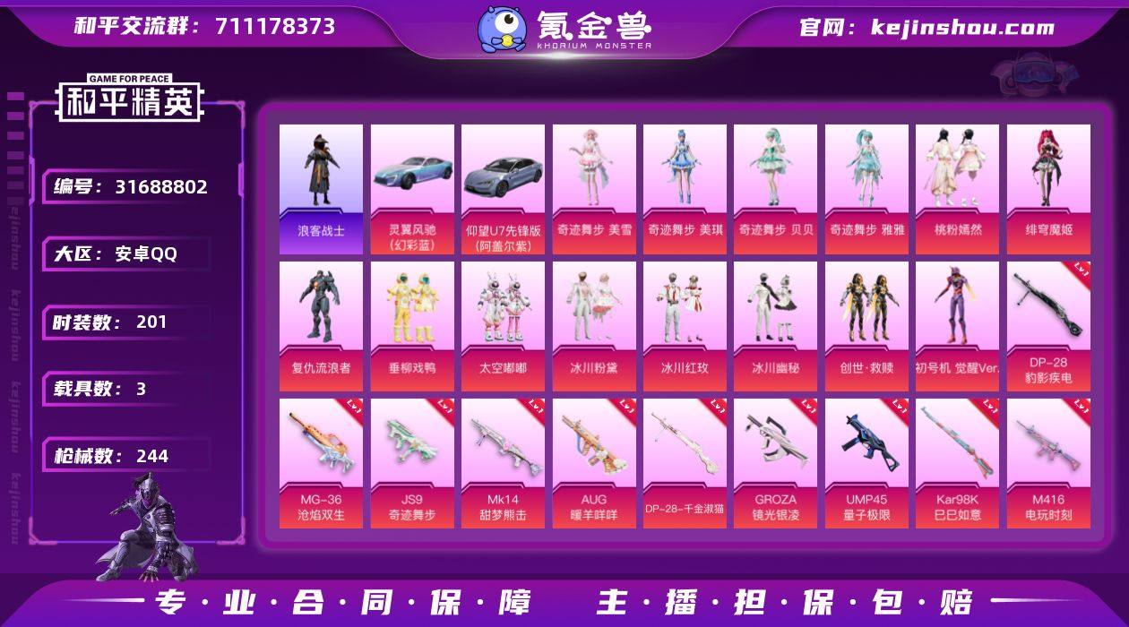 【AZH1785】苹果 手Q【无敌战神框 红螳螂蝶舞迷情小丑鱼 至情至圣M416 2载具】无敌战神框-5粉装-5特效枪-2载具-3粉色飞行器-65819热力值-11王牌印记-133套装-229枪皮 【热门品类】:套装-小丑鱼,角色-军刀雅典娜,套装-龟仙人 【粉色套装】:粉装-数码大师,粉装-蝶舞迷情,角色-2号机款机体服,粉装-闲梦青缨,粉装-极意拳锋 【粉色枪皮等级】:M416-至情至圣(八级),AUG-超新星(四级),蜜獾-异瞳寒姬(一级),Kar98K-巳巳如意(三级),DP-28-豹影疾电(五级) 【粉色载具】:玛莎拉蒂Quattroporte(夜幕蓝),宾利BATUR(极速紫) 【粉色枪皮】:M416-至情至圣,AUG-超新星,蜜獾-异瞳寒姬,Kar98K-巳巳如意,DP-28-豹影疾电 【粉色飞行器】:萌物绒绒飞行器 【粉色降落伞】:快乐主宰降落伞,百万伏特降落伞,梦幻火箭降落伞,炫紫旋律降落伞,神秘黑猫降落伞,星之彼岸降落伞,圣光天使降落伞,垂柳戏鸭降落伞,旋转彩虹降落伞,青空秋雨降落伞,第五大道降落伞,莲影清波降落伞,繁龙极客降落伞,精灵梦叶罗丽降落伞,创世·救赎降落伞,金丰海韵降落伞,无垠阁降落伞,炫彩糖果降落伞 【稀有套装】:套装-龟仙人,套装-炫彩糖果,套装-朱霞炽焰,套装-凌霄紫焰,套装-擎苍青焰,角色-绯色魅影,角色-紫俏灵猫 【稀有枪皮】:AUG-冰晶雪宝,AKM-四圣焕新,AKM-夜灯,AKM-星之彼岸,AKM-灼热熔岩,AKM-玉龙,AKM-破晓战魂,AKM-霓虹街区,AKM-龙的传人,M16A4-甜心亚梦,M16A4-蓝色火焰,SCAR-L-夜灯,SCAR-L-炫彩节奏,SCAR-L-玉兔迎春,SCAR-L-黄金龙骨,M416-夜灯,M416-神秘黑猫,M416-糯团青竹,M416-红色方程式,M416-蓝色火焰,GROZA-异彩先驱,GROZA-影袭,GROZA-懵萌河马,GROZA-春暖花开,GROZA-治愈之星,GROZA-田园牧歌,GROZA-酷泡奶龙,AUG-圣光天使,AUG-天降萌叽,M762-天降萌叽,M762-奇异狩猎者...