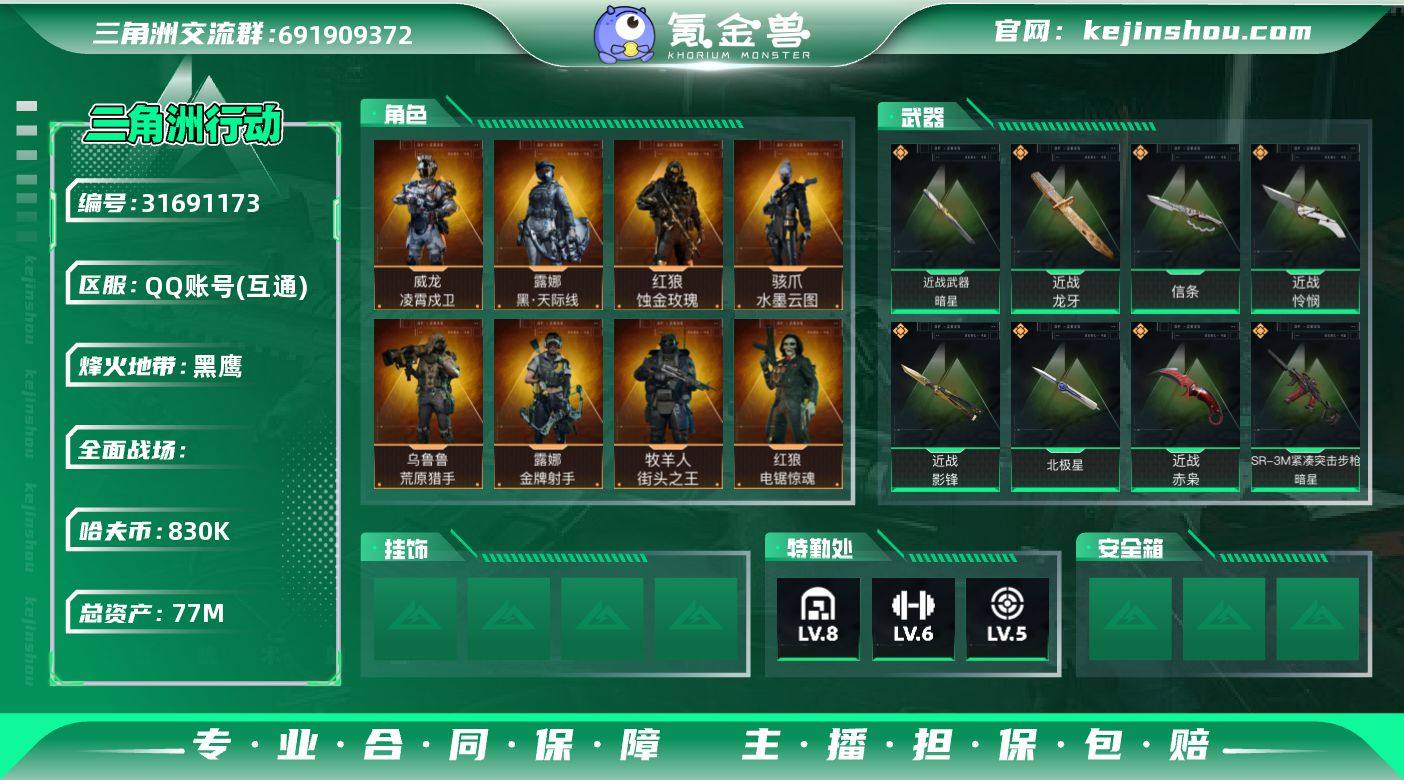 "YXB-S8赛季3*3【1463三角币-83w哈伏币-77m总资产-47m流动资产-60烽火等级-黑鹰】 【特勤处】仓库8-训中6-靶场5 部门:22322 【干员外观】:红狼-蚀金玫瑰,骇爪-水墨云图,露娜-黑·天际线,威龙-凌霄戍卫,威龙-壮志凌云,威龙-飞虎,蜂医-送葬人·无题密令,牧羊人-街头之王,无名-夜鹰,红狼-电锯惊魂,露娜-金牌射手,乌鲁鲁-荒原猎手 【近战皮肤】:近战-暗星,近战-北极星,近战-信条,近战-影锋,近战-怜悯,近战-赤枭,近战-龙牙,近战-黑鹰 【传说外观】:M4A1突击步枪-蚀金玫瑰,M4A1突击步枪-阿米娅,ASh-12战斗步枪-怜悯,M7战斗步枪-怜悯,M7战斗步枪-维京,SG552突击步枪-运动员,AK-12突击步枪-夜鹰,AK-12突击步枪-特斯拉线圈,SCAR-H战斗步枪-铁艺苍穹,SCAR-H战斗步枪-水墨云图,SCAR-H战斗步枪-启航,G3战斗步枪-骑士,CAR-15突击步枪-阿米娅,AS Val突击步枪-蛇年祥瑞,腾龙突击步枪-捞点薯条,K437突击步枪-北极星,KC17突击步枪-电锯惊魂,MK47突击步枪-暗星,P90冲锋枪-信条,UZI冲锋枪-特斯拉线圈,SMG-45冲锋枪-骑士,SR-3M紧凑突击步枪-特斯拉线圈,SR-3M紧凑突击步枪-暗星,勇士冲锋枪-能天使-午夜邮差,QCQ171冲锋枪-北极星,M1014霰弹枪-影锋,725双管霰弹枪-送葬人-无题密令,M14射手步枪-蛮荒,SR-25射手步枪-水墨云图,SR-25射手步枪-信条,AWM狙击步枪-影锋,AWM狙击步枪-捞点薯条,G18-飞虎,93R-捞点薯条,复合弓-黑·天际线 " "