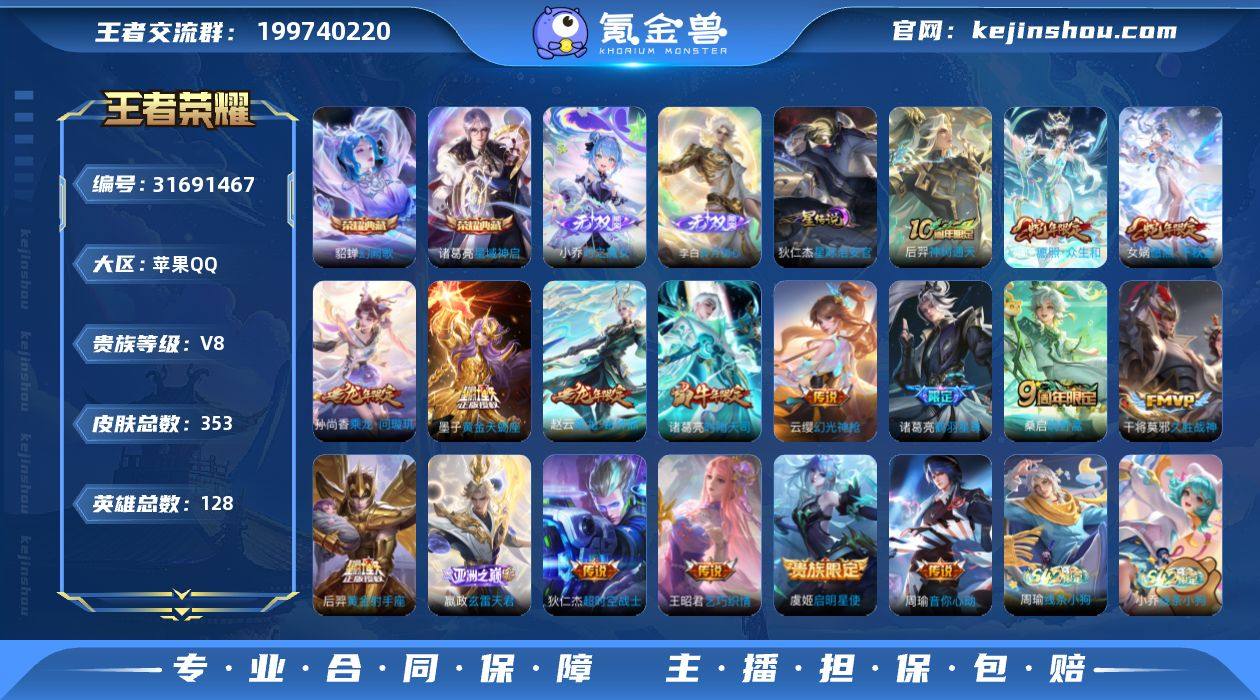 贵族8/皮肤353/典藏2/传说17/史诗100/英雄128/小国标妲己/小国标姜子牙/小国标金蝉/小国标米莱狄/小国标周瑜/金标亚瑟/金标黄忠/金标嫦娥/金标墨子/金标猪八戒/金标嬴政/金标元流之子(法师)/金标百里守约/金标钟馗/金标项羽/金标诸葛亮/金标沈梦溪/金标海诺/金标李白/金标王昭君/金标海月/金标后羿/金标铠/金标芈月/金标李信/嬴政全皮/孙权全皮/米莱狄全皮/金蝉全皮/戈娅全皮/海诺全皮/星域神启/幻阙歌/碎月剑心/小乔时之魔女/星际治安官/神树通天/愿照·千秋盛/愿照·众生和/幻光神枪/玄雷天君/鸣野蒿/黄金天蝎座/乘龙·问璇玑/乘龙·铭钟鼎/鹤羽星尊/乞巧织情/音你心动-周瑜/时雨天司/启明星使/久胜战神/黄金射手座/超时空战士-狄仁杰/阴阳师/皇家上将/神迹守卫-墨子/时之奇旅-妲己/优雅恋人/白昼王子/狮舞东方/高山流水/死亡摇滚/超时空战士-钟无艳/幻夜卜梦/猎兽之王/赤莲之焰/云间偶戏/无心/朔风刀(s17)/幽恒/游园惊梦/落雪兰心/穷奇(s12)/蓝屏警告/山海·玄木吟/魔术师/万华元夜(s22)/星际陆战队-达摩/沙漠行僧(s26)/海滩派对/醍醐杖(s20)/航海奇遇记/演武夺筹(s23)/午后时光/驯魔猎人/金庭之子(s27)/潮玩骑士王/御旌(s15)/辉光之辰/银河之约/云中旅人(s29)/神迹守卫-钟馗/驱傩正仪(s24)/遇见飞天/朔望之晖/胡桃夹子/黎明之约/原初探秘者(s21)/五谷丰年/火炮绅士/千军破阵(s25)/原初追遂者/混沌棋(s18)/顽趣-梦奇/星空之诺/大漠名商(s28)/匿光破解者/疑决卦(s19)/李小龙/擒涛扼浪(s31)/御狮(s13)/电玩高手/御霄(s14)/胡桃异想国/纤云弄巧/御銮(s16)/猪悟能/梁祝/拒霜思/暖冬·兔眠/玲珑珍味/探海日志(s32)/海盐诗旅(s30)/唐三藏/星界游侠/驭风魔法/流音漫舞/地狱燃心/江河有灵/古海寻踪(s33)/百解令(蒙犽)/蒙恬荣光圣徽/高渐离燃音魔法/妲己灵卜魔法/鬼谷子天穹祈灯(S34)/琥珀纪元伽罗/乘龙·忆丹青/龙武盛年/蔬乡...
