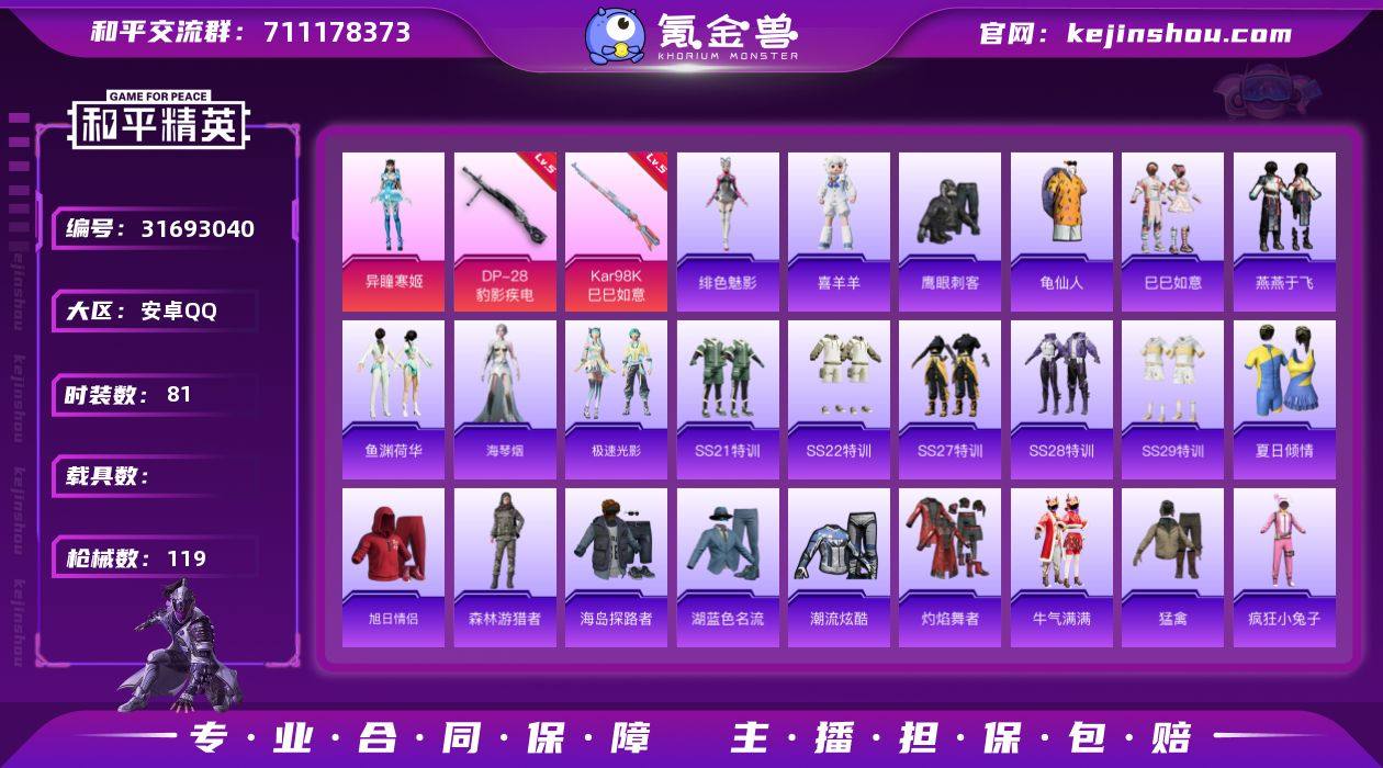 安卓 手Q-1粉装-4特效枪-0载具-1粉色飞行器-29153热力值-3王牌印记-81套装-119枪皮 【热门品类】:套装-龟仙人 【粉色套装】:角色-异瞳寒姬 【粉色枪皮等级】:Kar98K-巳巳如意(五级),DP-28-豹影疾电(五级) 【粉色枪皮】:Kar98K-巳巳如意,Mk14-福马献瑞,DP-28-豹影疾电 【粉色飞行器】:炫彩糖果飞行器 【粉色降落伞】:智耀战神降落伞,异瞳寒姬降落伞,炫彩糖果降落伞 【稀有套装】:套装-龟仙人,套装-巳巳如意,套装-炫彩糖果,套装-燕燕于飞,套装-鱼渊荷华,角色-海琴烟,套装-极速光影,玩偶服-喜羊羊,角色-绯色魅影,套装-雨过天青,套装-红釉青花 【稀有枪皮】:AUG-冰晶雪宝,AKM-破晓战魂,M16A4-红色方程式,SCAR-L-夜灯,SCAR-L-红色方程式,M416-蓝色火焰,GROZA-田园牧歌,AUG-天降萌叽,AUG-幻影战神,AUG-耀粉歌者,AUG-月影灵韵,QBZ-洛神天依,M762-牛气冲天,Mk47-洛神天依,Mk47-炫光之旅,G36C-星穹咏叹调,蜜獾-天降萌叽,蜜獾-绯穹魔姬,ACE32-蓝晶绮麟,UZI-啾咪啾咪,UZI-天降萌叽,UZI-红色方程式,UMP45-夜灯,UMP45-炫光之旅,UMP45-蓝色火焰,汤姆逊-天降萌叽,汤姆逊-耀粉歌者,AKS-74U-荧光像素,P90-巳巳如意,Kar98K-红色方程式,SKS-炫彩节奏,Mini14-炫彩节奏,Mini14-耀粉歌者,AMR-喜羊羊与灰太狼,S686-生命誓言,S686-巳巳如意,S1897-炫彩节奏,S12K-玩趣呆呆,S12K-破晓战魂,S12K-夜灯,S12K-幻影战神,DBS-幻彩电音,M249-破晓战魂,DP-28-彩虹符号,MG3-幻世战舞者,MG3-瑞龙福将,破片手榴弹-巳巳如意 【其他套装】:套装-SS21特训,套装-SS22特训,套装-SS27特训,套装-SS28特训,套装-SS29特训,套装-夏日倾情,套装-旭日情侣,套装-森林游猎者,套装-海岛探路者,套装-湖蓝色名流,套装-潮流炫酷,套装-灼焰舞者,套装-牛气满满,套装-猛禽,套装-疯狂小...