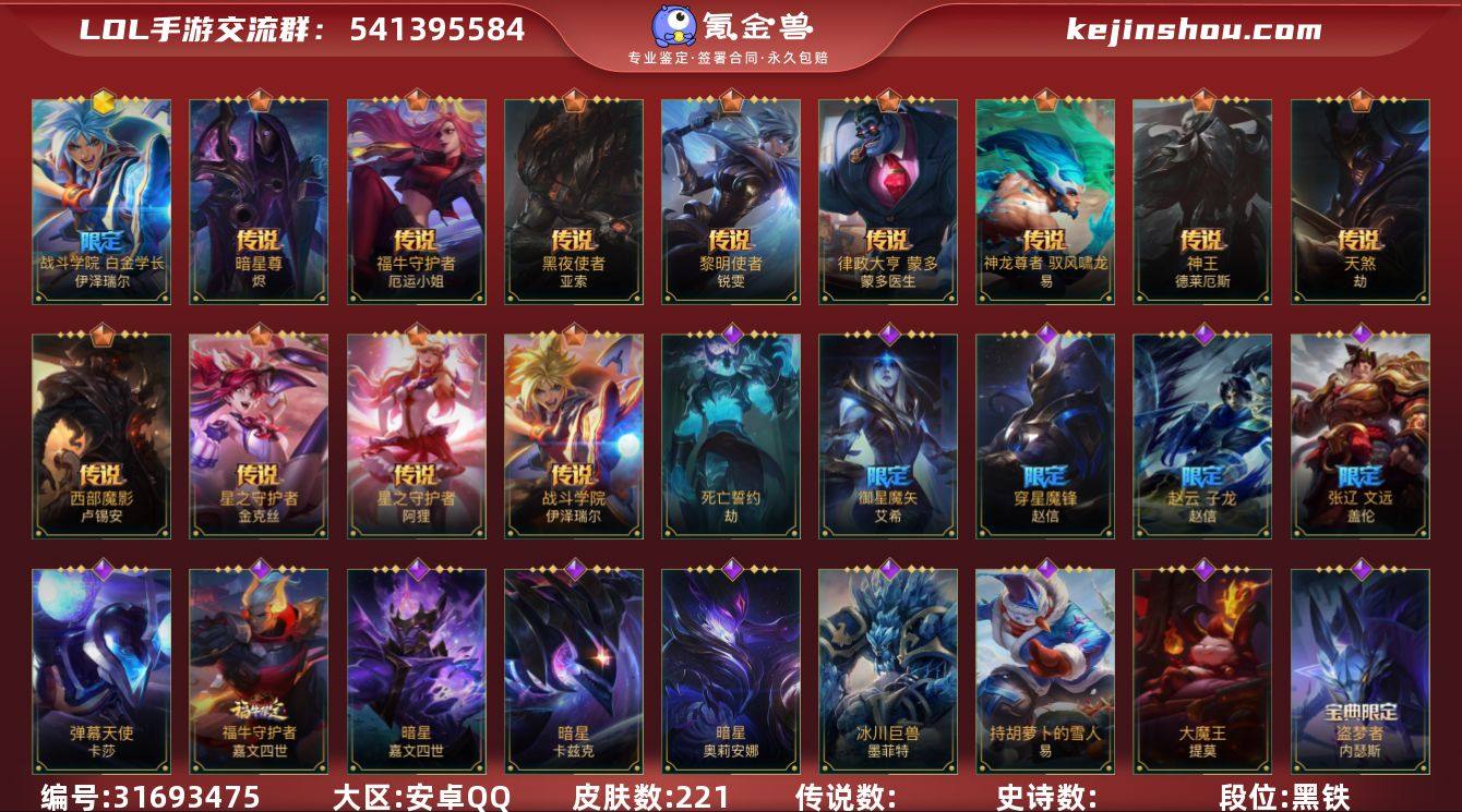 t36539【安卓QQ】英雄128 皮肤291 7神话/33传说/152史诗/ 傲世宗师 【游戏等级】187 【游戏区服】安卓QQ 【英雄数量】128 【皮肤数量】291 【游戏段位】傲世宗师 【终极皮肤】0 【典藏皮肤】0 【神话皮肤】7 流光仙韵莫甘娜 狂潮裂变金克丝 此志凌云嘉文四世 桃映暖春灼灼芳菲拉克丝 玄龙绛天易 春晖仙子苍云缥缈卡莎 战斗学院白金学长伊泽瑞尔 【传说皮肤】33 春晖神裔辛德拉 翩翩绣蕊霞 律政大亨蒙多医生 御风墨影亚索 淳和墨意嘉文四世 暗星女王拉克丝 暗星尊烬 斗魂无双亚索 福牛守护者厄运小姐 光明哨兵格雷福斯 光明哨兵薇恩 黑夜使者亚索 黎明使者锐雯 黎明使者永恩 女主播迦娜 欧米伽小队幽灵特工提莫 神龙尊者驭风啸龙易 神拳李青 神王盖伦 神王德莱厄斯 天煞劫 涂鸦小队莎弥拉 西部魔影卢锡安 星域游侠崔斯特 星之守护者卡莎 星之守护者阿狸 星之守护者辉霞 星之守护者陨洛 源计划净化薇恩 源计划联合艾希 源计划林易 战斗学院凯特琳 战斗学院伊泽瑞尔 【稀有回城特效】 【史诗皮肤】152 中霆之擎瑟提 百沸鲜香吉格斯 洗地专家锤石 蕊雪盈春晏安赫卡里姆 狂潮异想金克丝 抵抗军雷神杰斯 红帽迷影薇古丝 欧米伽小队天雷爆破手维迦 游梦仙境莉莉娅 桃映暖春拉克丝 金玉贺吉艾瑞莉娅 翼翼飞花洛 福纳康宁伊芙琳 我羽饰骑士崔丝塔娜 梦境绅探凯南 北极星霜潮娜美 北极星守护者赫卡里姆 永恒之森霞 双城之战天资金克丝 水晶玫瑰艾希 猎梦吞噬体卡兹克 玉剑传说无影泰隆 玉剑传说舞龙卫希瓦娜 玉剑传说无劫劫 神龙尊者炎龙瑟提 电玩女神凯特琳 涂鸦小队泽丽 温雅墨曲迦娜 秀逸墨羽霞 端劲墨印泰达米尔 黯晶巨鳄雷克顿 暗星韦鲁斯 暗星嘉文四世 暗星墨菲特 暗星卡兹克 暗星奥莉安娜 奥术大师吉格斯 霸天巨兽墨菲特 霸天异形卡兹克 霸天战士雷恩加尔 霸天战鹰加里奥 白色死神韦鲁斯 冰川巨兽墨菲特 冰糖葫芦维迦...