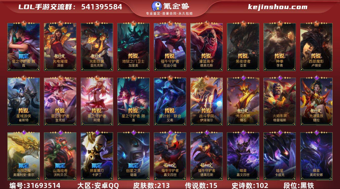 【编号14853】店长推荐特价处理精品号 113英雄-213皮肤 【限定皮肤】:创星之灵 璐璐,掠星魔刃 卡萨丁,山海绘卷 沃利贝尔 【传说皮肤】:光影巨翼 亚托克斯,星之守护者 金克丝,星域游侠 崔斯特,黑夜使者 亚索,星之守护者 阿狸,西部魔影 卢锡安,星之守护者 辉 霞,星之守护者 陨 洛,神拳 李青,福牛守护者 厄运小姐,光电璀璨 泽丽,灌篮高手 德莱厄斯,源计划:联合 艾希,战斗学院 伊泽瑞尔,地狱之门卫士 加里奥 【史诗皮肤】:钢铁军团 盖伦,腥红之月 亚托克斯,战斗学院 拉克丝,惊悚派对 阿木木,地狱火 阿木木,摄魂猎手 凯隐,霸天战士 雷恩加尔,星域先知 卡尔玛,地狱行者 孙悟空,探梦奇旅 艾克,暗星 奥莉安娜,腥红之月 黛安娜,暗星 卡兹克,烘焙童谣 悠米,圣诞老人 布隆,灭迹行者 烬,灰烬领主 奥瑞利安·索尔,东恒之曜 奥瑞利安·索尔,K/DA ALL OUT 卡莎,神龙尊者 玉境灵龙 卡莎,玉剑传说 苍鸾 莫甘娜,K/DA ALL OUT 伊芙琳,猎龙勇士 潘森,铁血女忍 阿卡丽,源计划:火 菲奥娜,玉剑传说 无双 菲奥娜,福牛守护者 菲奥娜,战场之王 布里茨,福牛守护者 安妮,幻梦甜心 阿狸,源计划:阴 劫,秘旅探索者 贾克斯,灵能特工 凯尔,屠龙勇士 凯尔,娜就去看看 崔丝塔娜,小蜜蜂 提莫,泳池派对 璐璐,星之守护者 璐璐,创星之灵 璐璐,银河魔装机神 希瓦娜,秘旅探索者 希瓦娜,源计划:裁决 蔚,炼狱魔女 蔚,燎原烈焰 蔚,太空律动 “百万调音” 格温,源代码 卡蜜尔,暗星 嘉文四世,福牛守护者 嘉文四世,山海绘卷 沃利贝尔,地下拳王 李青,柯基 库奇,冰封王子 蒙多医生,魔女 婕拉,光源盛放 婕拉,盗梦者 内瑟斯,源计划:燃 泽丽,灵魂莲华 永恩,持胡萝卜的雪人 易,福牛守护者 德莱厄斯,泳池派对 格雷福斯,禁卫机甲 格雷福斯,绝命机甲 格雷福斯,光焰澎湃 格雷福斯,玉剑...