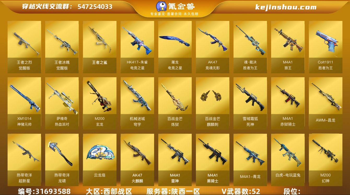 西部战区(陕西一区)lb【精品爆破号】【一万八千点券】52v【幻神套装+双音效卡+双皮/宠儿/电流骇客,Kar98K-星神+皮/漫游,热带奇洋套装,QBZ03-金色蔷薇,AWM-裁决套装+三皮/叶芒苍灵/百城联赛天津/运输船,白虎-电玩蓝兔,HK417-朱雀,M4A1-青龙,白虎-九尾妖狐,QBZ03-独角-III,柯尔特-电竞之星,云龙扇,Colt1911-大黄蜂,QBZ03-吕布】3王者【王者之鲨,王者冰魄,王者之烈】8角色【王者凌霄,零,零-纪元,战地猎狐,幻面灵狐,葵-阿尔法武装,奇洋探员,雪域霜狐】13音效【M200-幻神音效卡*2,M4A1-黑骑士音效卡,死神-雪域霜狐-怀旧音效卡,Barrett-毁灭音效卡,炼狱-百战金芒-庆典舞曲音效卡,Barrett-碧霄极光音效卡,AWM-裁决音效卡,屠龙-电竞之星-竞星悦动音效卡,HK417-朱雀-电竞之星-竞星悦动音效卡】31皮【幻神-宠儿,幻神-电流骇客,星神-漫游,裁决-叶芒苍灵,裁决-百城联赛天津,裁决-运输船,雷神-炽焰,屠龙-星火燎原,白虎-百战金芒,屠龙-破浪逐光屠龙-惊鸿,黑骑士-耀金,火麒麟-雷神,擎天-蒸汽钟表,白虎-暗星,炼狱-电子连击,毁灭-虹光风暴,雷神-神秘按键,毁灭-英雄计划,天龙-CF STAR,火麒麟-CF STAR,修罗-CF STAR,雷神-虎将,毁灭-荣耀之怒,火麒麟-华夏之心,火麒麟-轻羽】VIP4截图展示段位不代表实际段位 如赛季更新等不可抗拒因素发生变化、时限道具不保证所剩时间
